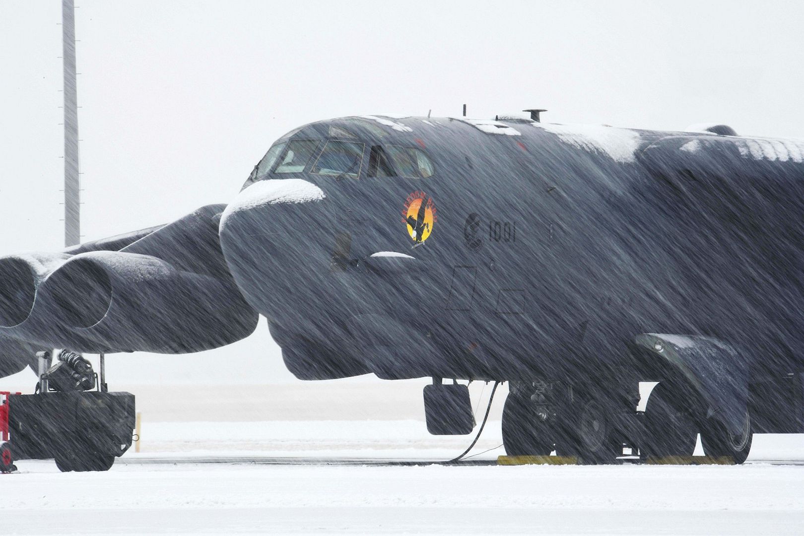 A B-52H Stratofortress idles as Airmen get ready to fly at Minot Air Force Base, North Dakota, Feb. 24, 2021. The bomber is capable of flying at high subsonic speeds at altitudes up to 50,000 feet (15,166.6 meters). It can carry nuclear or precision guided conventional ordnance with worldwide precision navigation capability. (U.S. Air Force photos by Senior Airman Dillon J. Audit)