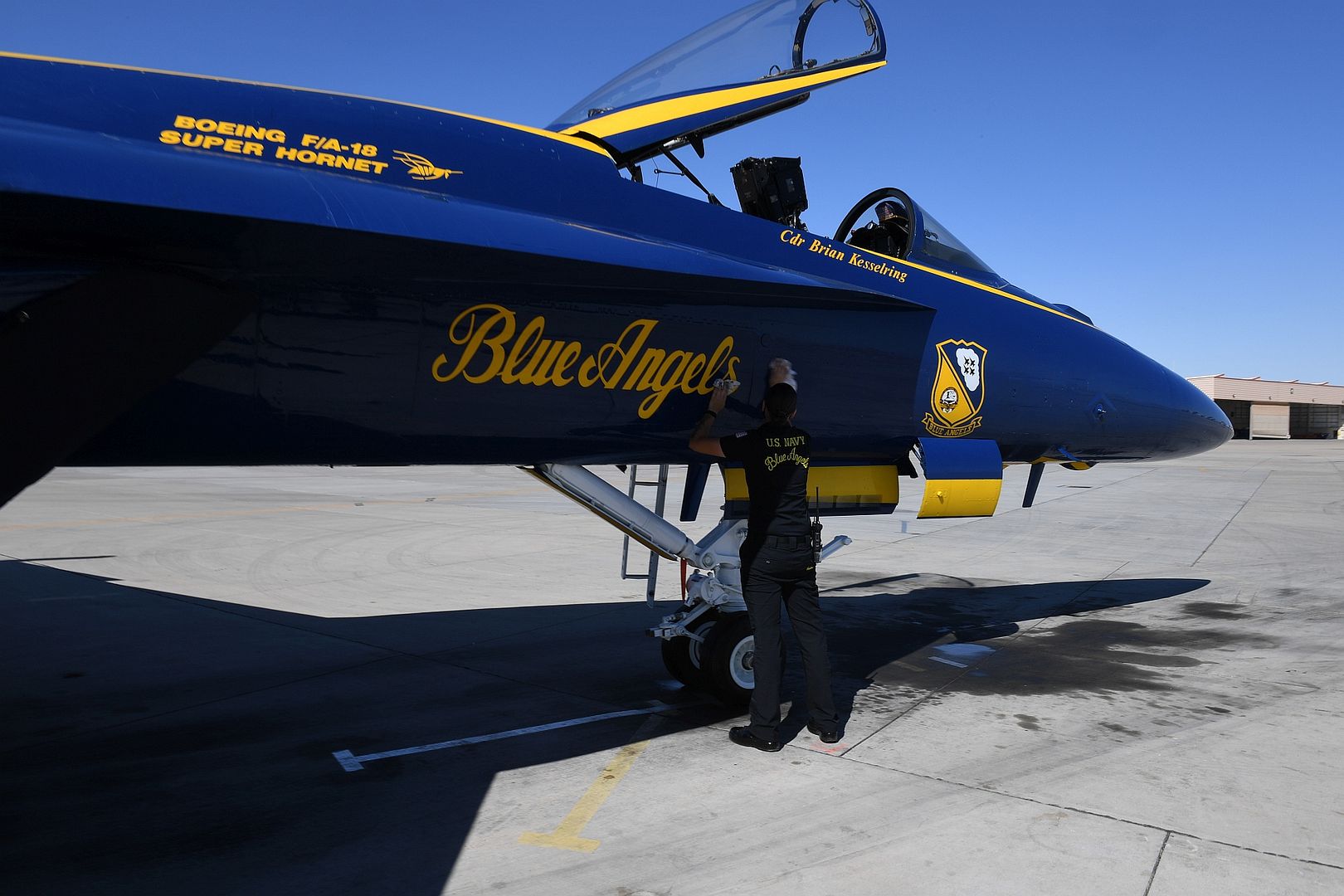 El Centro, Calif. (Feb. 24, 2021) Sailors attached to The U.S. Navy Flight Demonstration Squadron, the Blue Angels, conduct routine prep and show-clean onboard Naval Air Facility (NAF) El Centro February 24, 2021. The U.S. Navy Flight Demonstration Squadron, the Blue Angels, and the U.S. Air Force Air Demonstration Squadron, the Thunderbirds, will conduct 2nd Annual Joint Training onboard Naval Air Facility (NAF) El Centro, February 24- March 3, to trade best practices and lessons learned in preparation for the 2021 show season. (U.S. Navy photo by Mass Communication Specialist 3rd Class Drew Verbis)