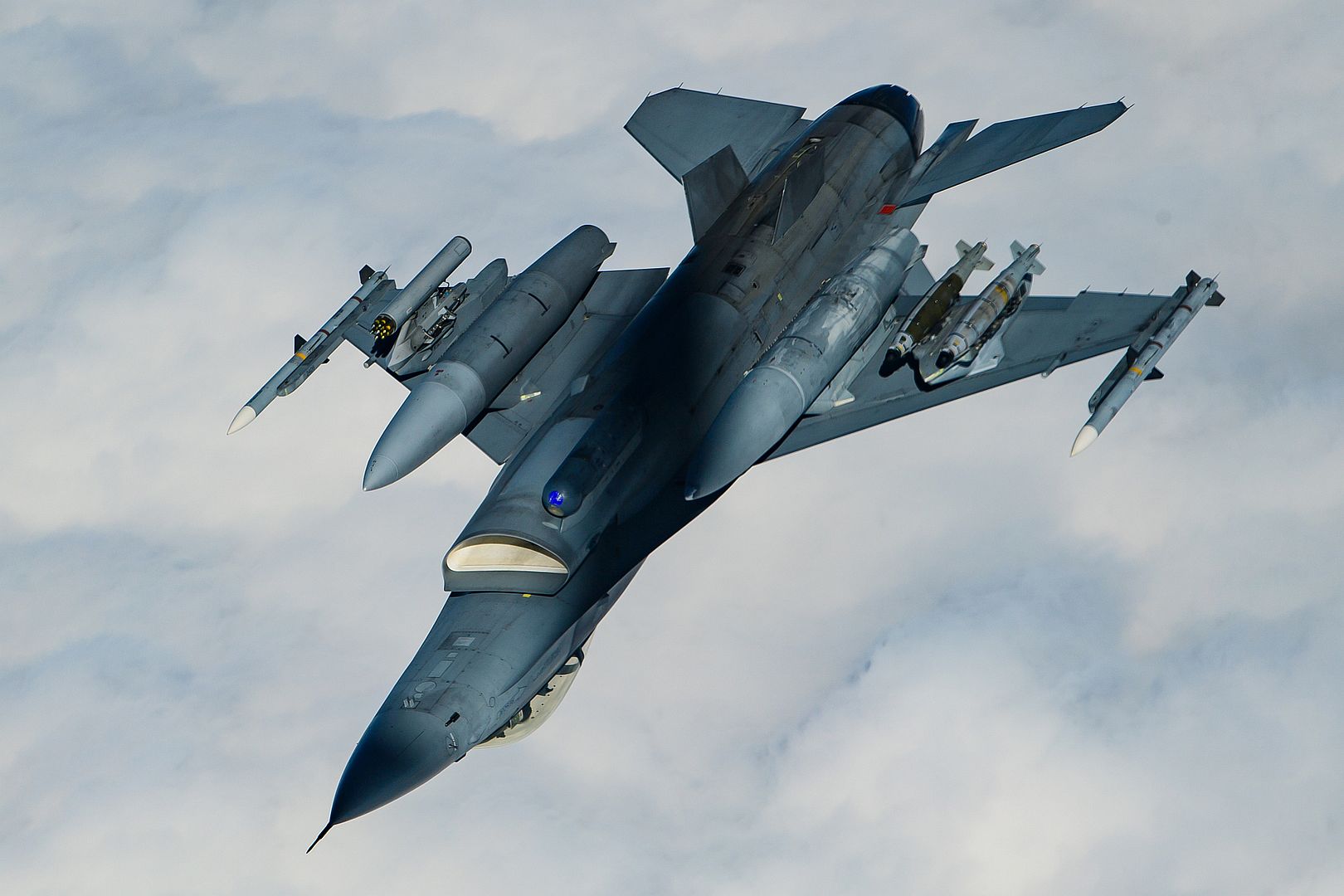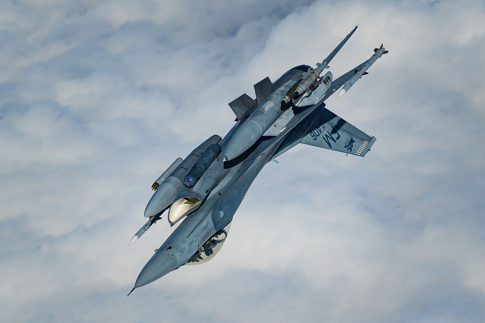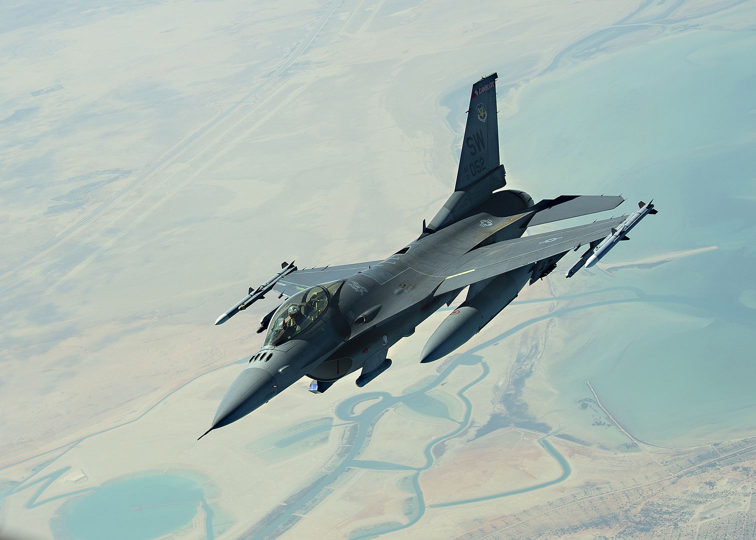 A U.S. Air Force F-16 Fighting Falcon aircraft pilot flies over Southwest Asia during an aerial refueling mission with a KC-135R Stratotanker aircraft, assigned to the 340th Expeditionary Air Refueling Squadron, Feb. 26, 2021. The F-16 is a compact, multirole fighter aircraft that delivers airpower to the U.S. Central Command area of responsibility. (U.S. Air Force photos by Master Sgt. Joey Swafford)