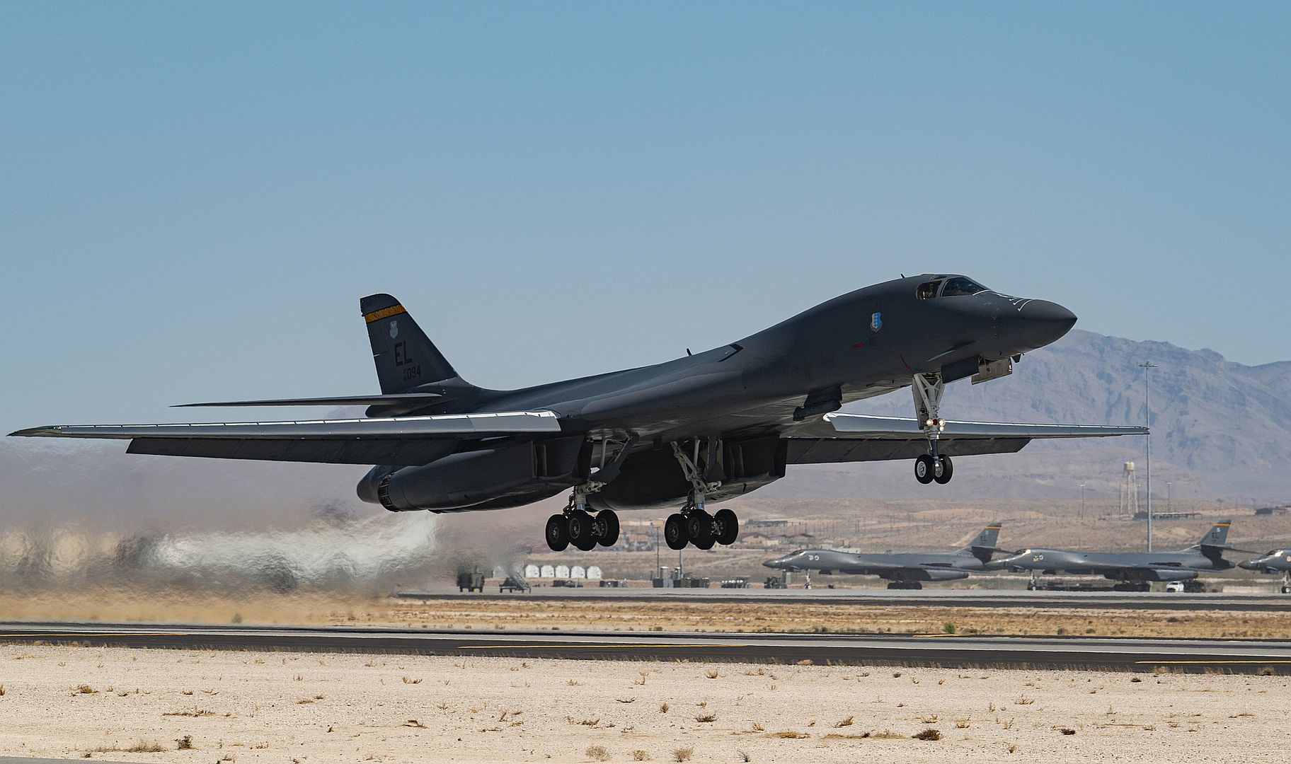 A B-1B Lancer, assigned the 28th Bomb Wing, Ellsworth Air Force Base, South Dakota, takes-off for a Red Flag 21-2 mission at Nellis Air Force Base, Nevada, March 8, 2021. The B-1 can carry the largest conventional payload of both guided and unguided weapons in the Air Force inventory. (U.S. Air Force photo by William R. Lewis)