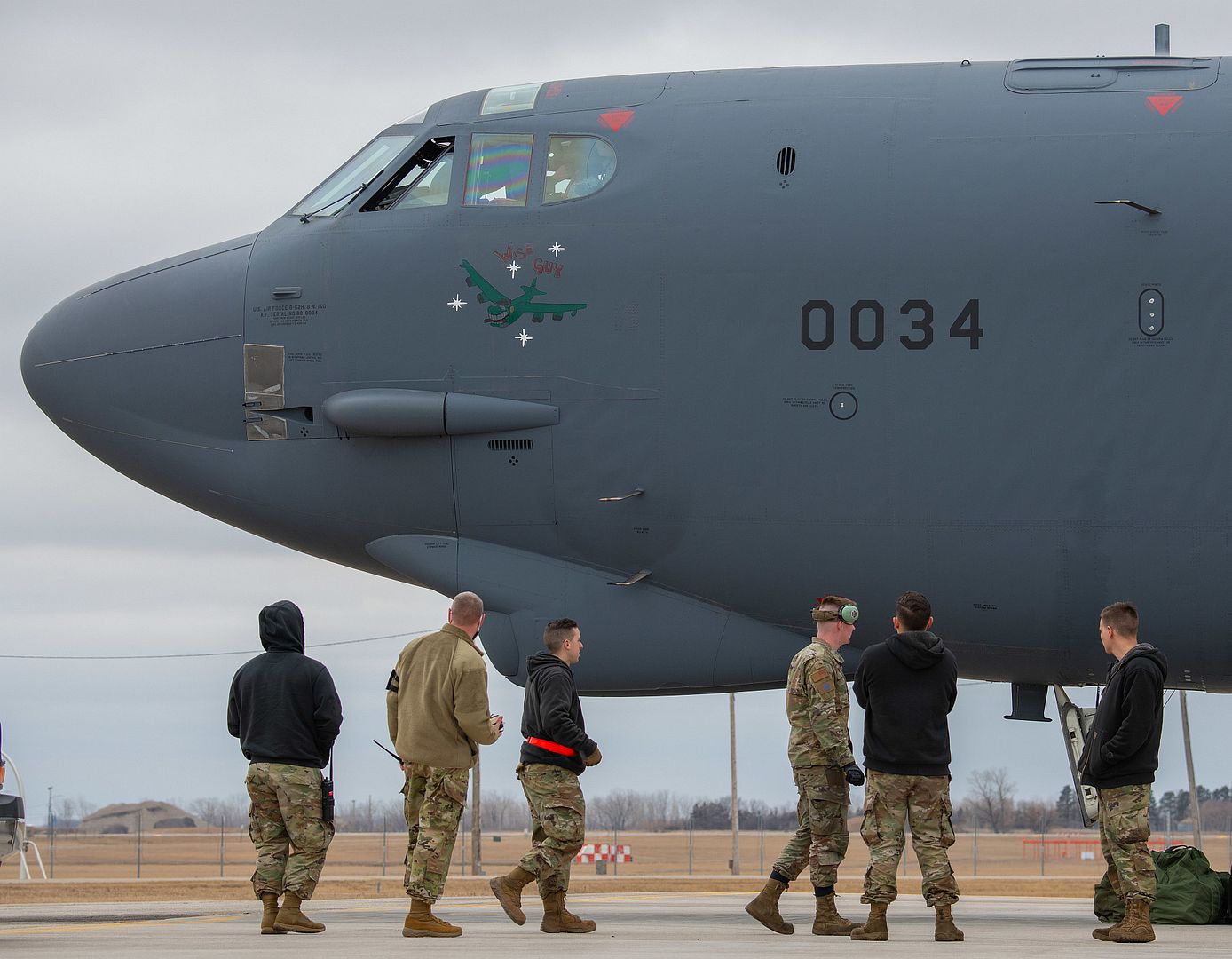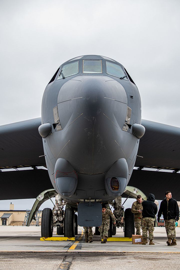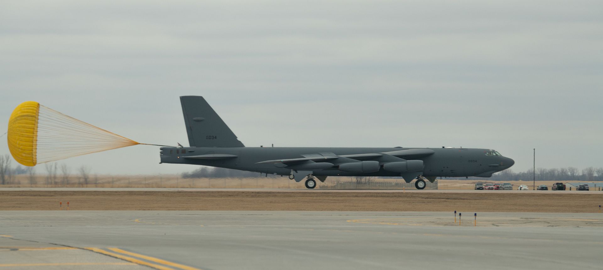 A B-52H Stratofortress "Wise Guy" lands on March 9, 2021 at Minot Air Force Base, ND. Wise Guy is one of the last B-52's to be resurrected from Davis-Monthan Air Force Base. (Air Force photo by Airman 1st Class Jesse Jenny)