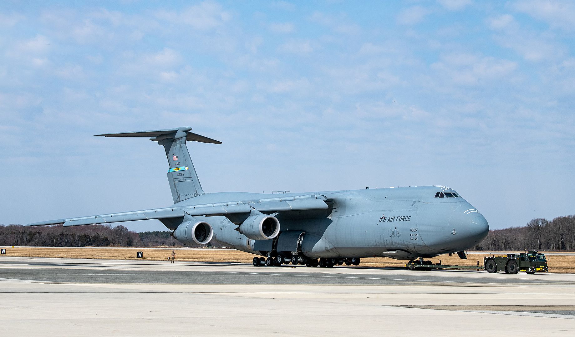 A maintenance tow team from the 436th Aircraft Maintenance Squadron tows a C-5M Super Galaxy on the flight line at Dover Air Force Base, Delaware, March 9, 2021. The 436th AMXS is responsible for the inspection, repair, launch and recovery of 18 assigned C-5 aircraft. (U.S. Air Force photo by Senior Airman Christopher Quail)