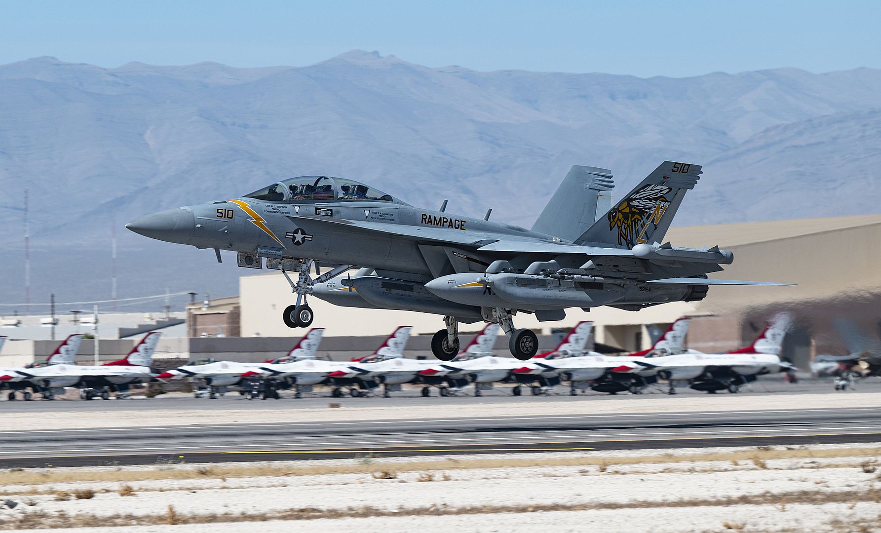 A U.S. Navy EA-18G Growler aircraft assigned to Electronic Attack Squadron 138 at Naval Air Station Whidbey Island, Washington, takes-off during Red Flag 21-2 at Nellis AFB, Nevada, March 8, 2021. Red Flag is the U.S. Air Force’s premier air-to-air combat training exercise, which provides aircrews the experiences of multiple, intensive air combat sorties in the safety of a training environment. (U.S. Air Force photo by William R. Lewis)