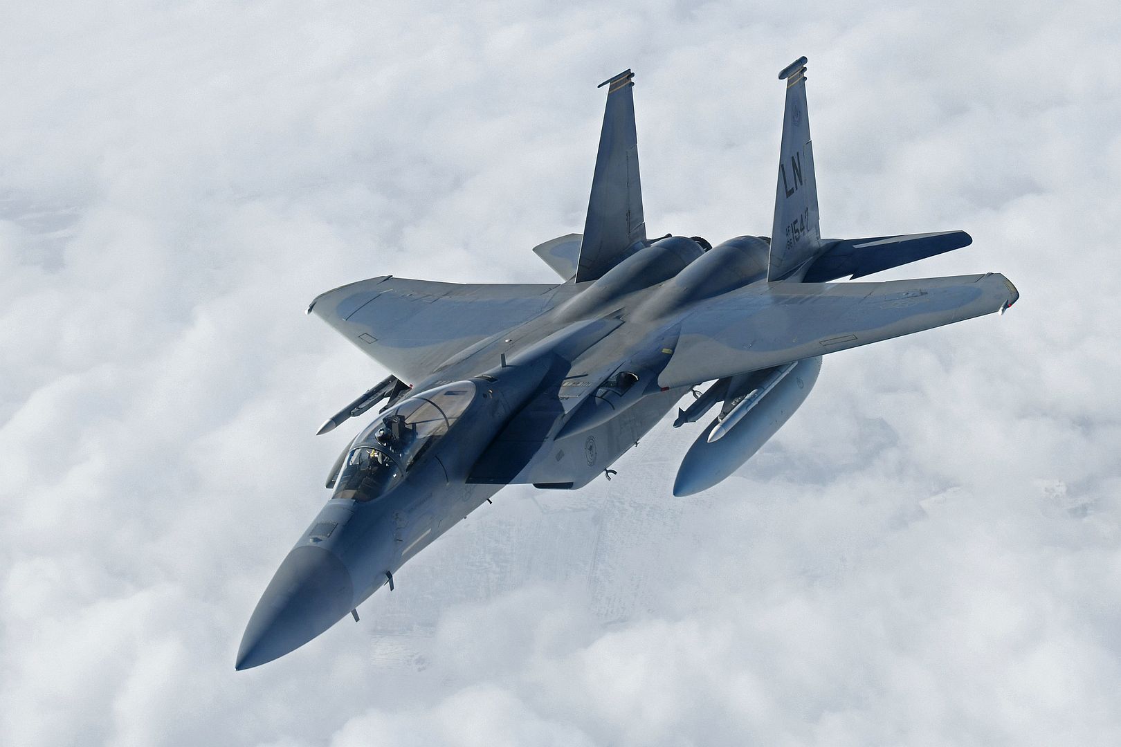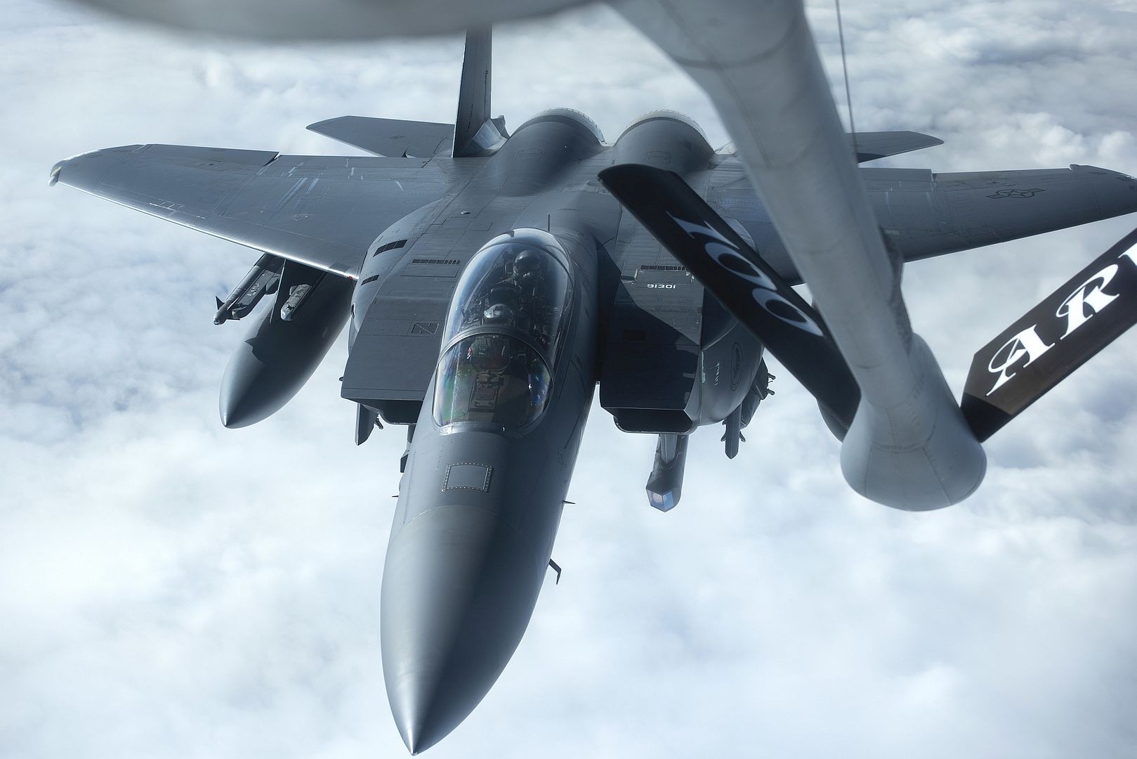 A U.S. Air Force F-15C Eagle aircraft assigned to the 48th Fighter Wing departs after receiving fuel from a KC-135 Stratotanker aircraft during exercise Baltic Trident over Estonia, March 18, 2021. Exercise Baltic Trident aims to strengthen allied partnerships across the European area of responsibility. (U.S. Air Force photo by Tech. Sgt. Anthony Hetlage)