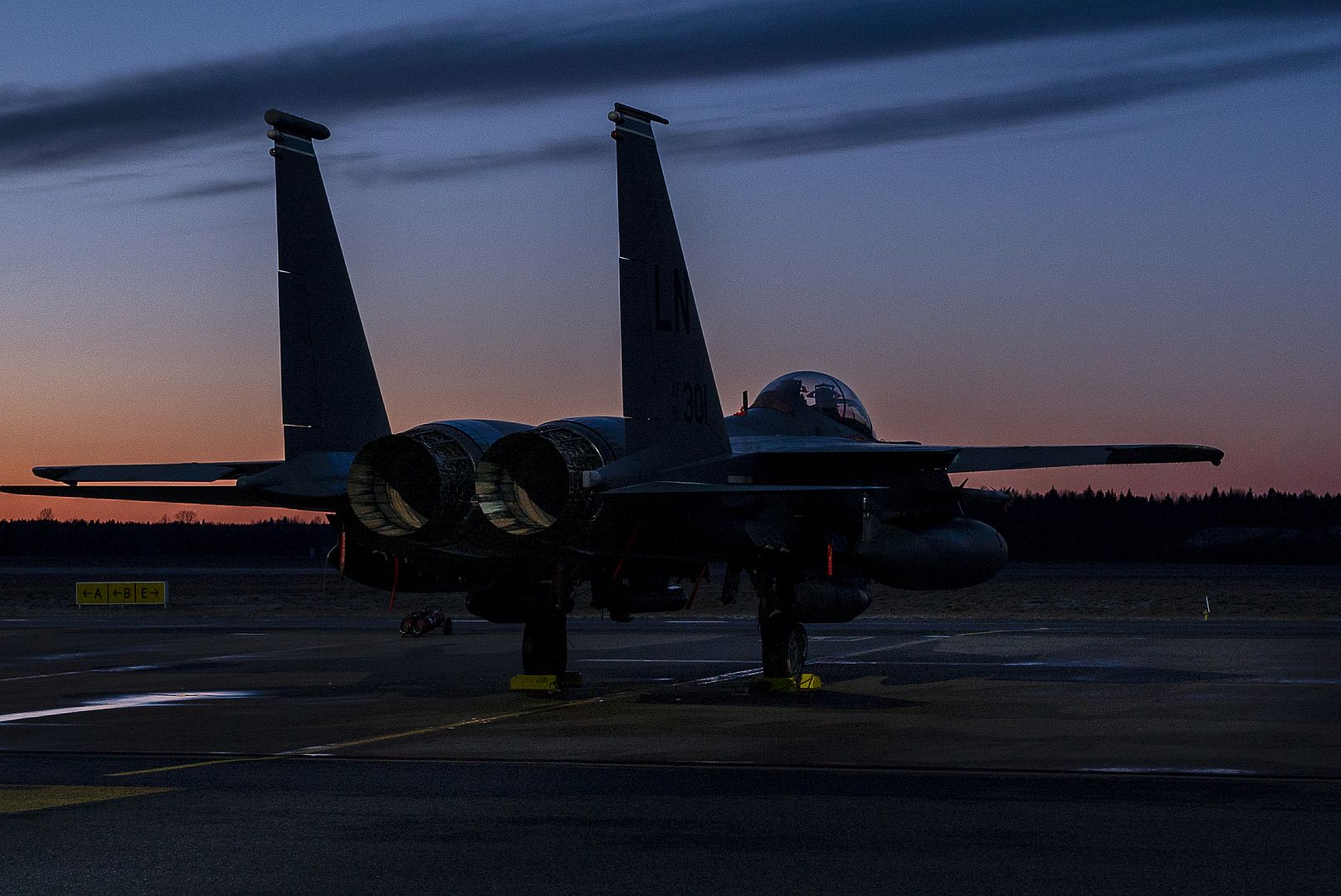 An F-15E Strike Eagle assigned to the 492nd Fighter Squadron sits on the apron at Ämari Air Base, Estonia, March 19, 2021. Aircraft and Airmen from the 48th Fighter Wing were in Estonia for Baltic Trident, an Agile Combat Employment exercise conducted to enhance 48th FW flexibility to support and engage NATO and partner forces in the Baltic Region. (U.S. Air Force photos by Airman 1st Class Jessi Monte)