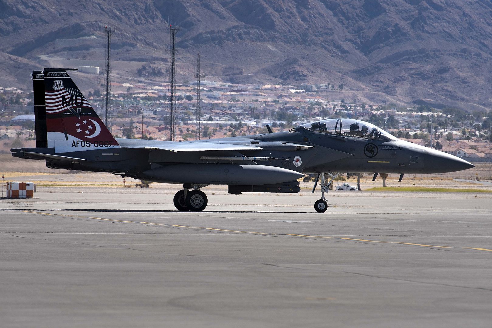 An F-15SG Strike Eagle from the 428th Fighter Squadron taxis on the runway at Nellis Air Force Base, Nevada, March 4, 2021. Over the course of two weeks, 2,500 service members will participate in Red Flag 21-2 to train in intensive simulated air combat sorties. (U.S. Air Force photo by Airman 1st Class Natalie Rubenak)