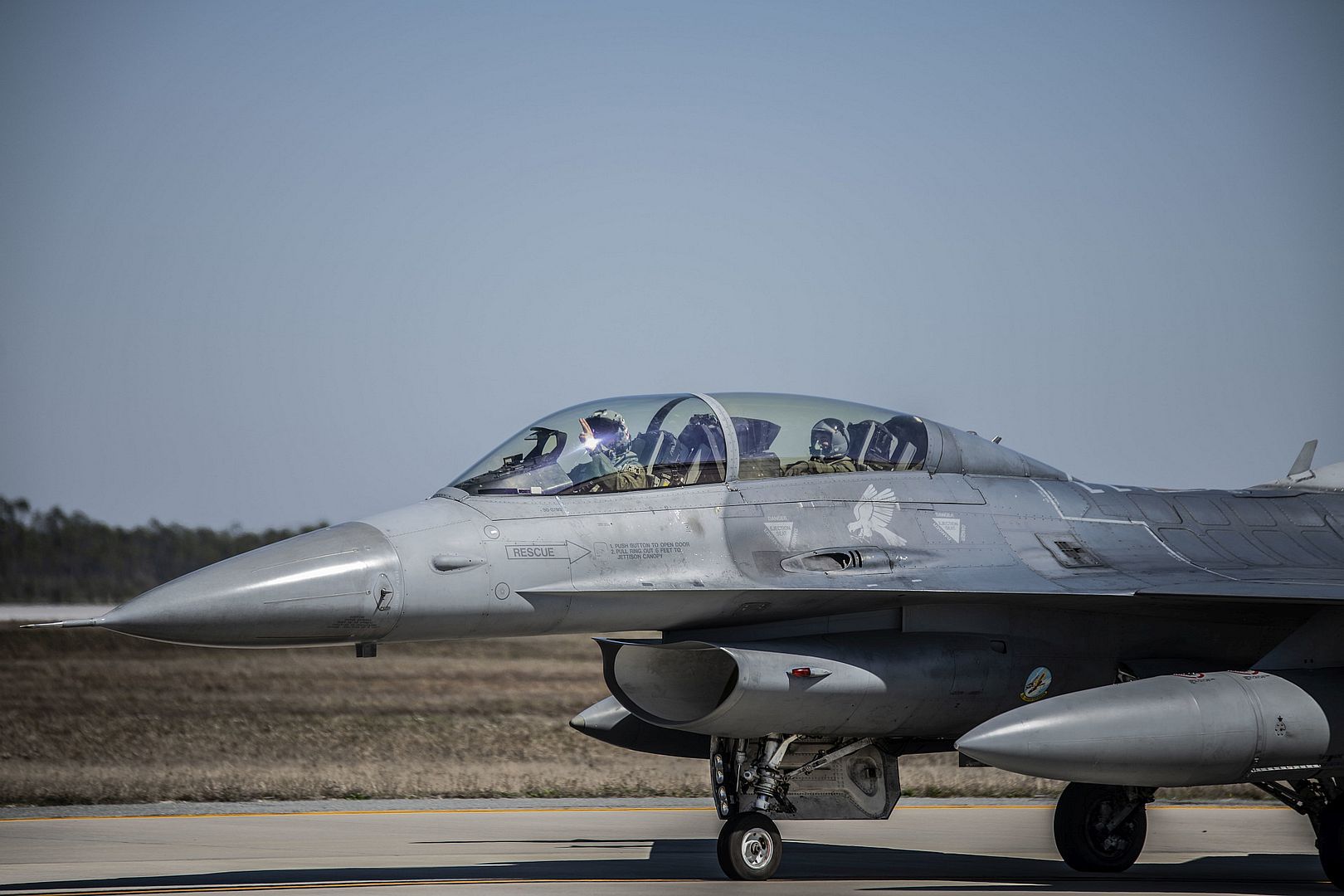 A U.S. Air Force F-16 Fighting Falcon assigned to the 314th Fighter Squadron from Holloman Air Force Base, New Mexico, taxis onto the runway at Tyndall Air Force Base, Florida, March 8, 2021. Tyndall hosts frequent Weapons System Evaluation Programs where aircraft from across the Department of Defense come to test their air-to-air combat capabilities. (U.S. Air Force photo by Airman 1st Class Tiffany Price)