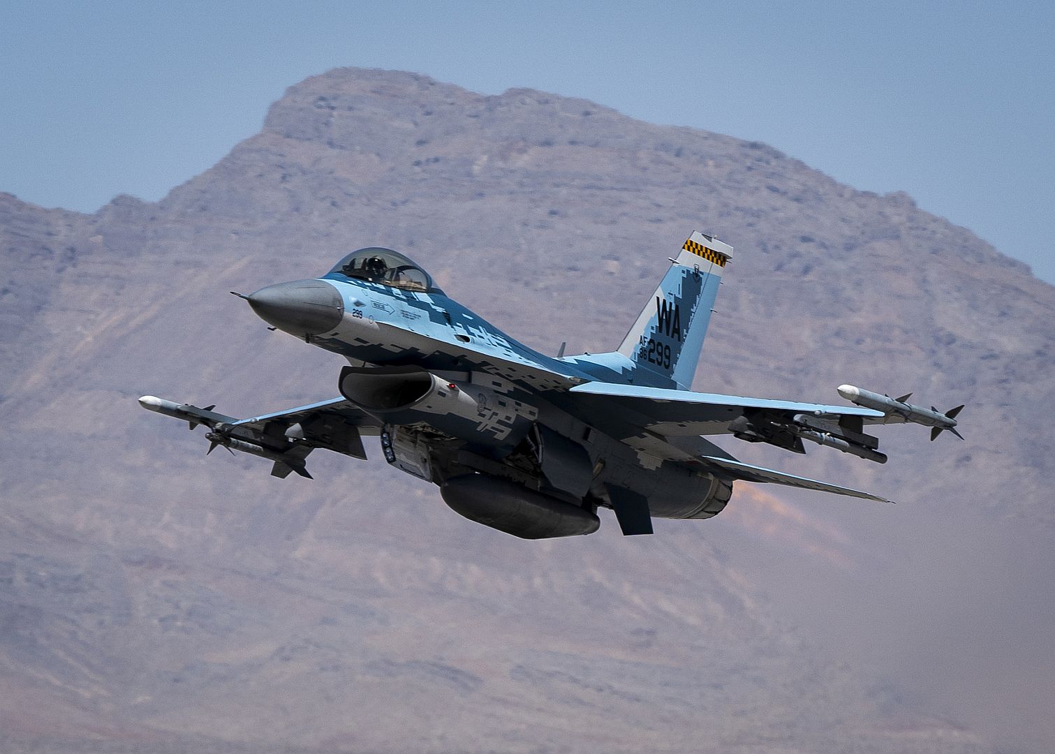 An F-16 Fighting Falcon from the 64th Aggressor Squadron takes flight for Red Flag 21-2 at Nellis Air Force Base, Nevada, March 8, 2021. The 64th AGRS prepares U.S. allied and partner nation aircrews for aerial combat with accurate and realistic threat replication training. (U.S. Air Force photos by Airman 1st Class Natalie Rubenak and by Senior Airman Dylan Murakami)