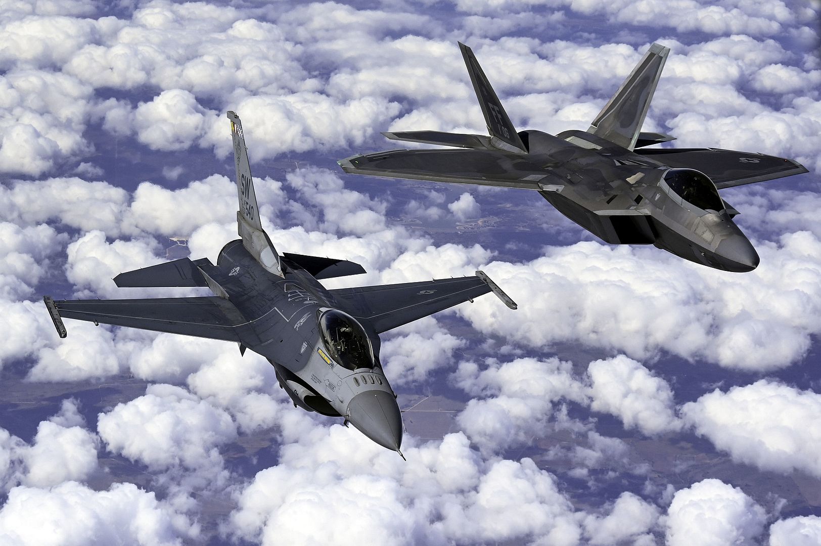 Pilots with the F-16 Viper and F-22 Raptor Demonstration Teams fly behind a KC-135 Stratotanker from the 465th Air Refueling Squadron assigned to Tinker Air Force Base, Oklahoma March 8, 2021. The F-16 team from Shaw Air Force Base, South Carolina, and the F-22 team from Joint Base Langley–Eustis, Virginia, are assigned to Air Combat Command and received fuel from the Okies during their flight back to their home stations after performing at an air show. (U.S. Air Force photo by Senior Airman Mary Begy)
