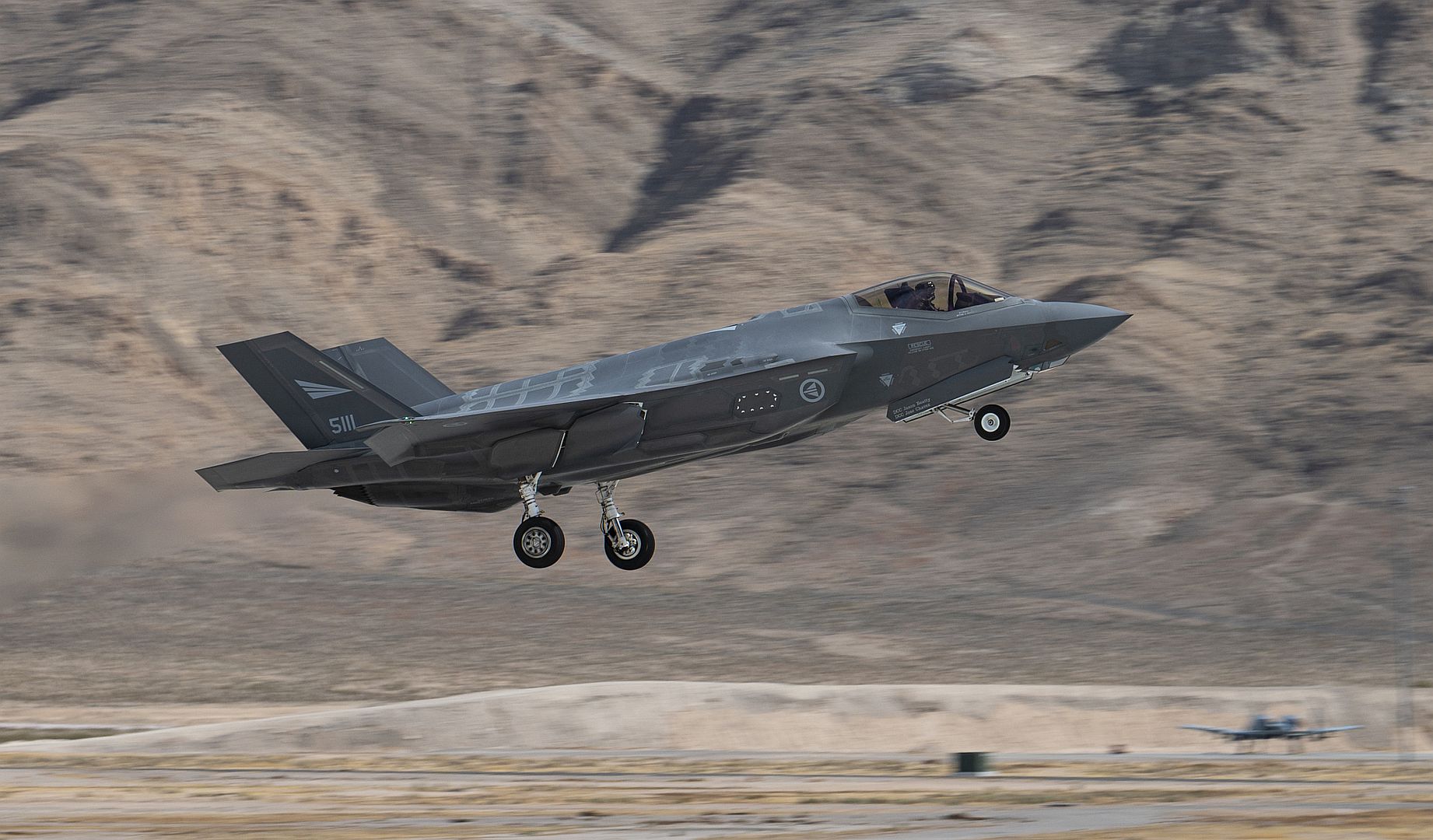 A Norwegian F-35A Lightning II fighter jet assigned to the 62nd Fighter Squadron, Luke Air Force Base, Arizona, takes-off for a mission during Red Flag 21-2, at Nellis Air Force Base, Nevada, March 9, 2021. The 62nd Fighter Squadron conducts F-35 pilot training for U.S. and allied aircrews. (U.S. Air Force photo by William R. Lewis)
