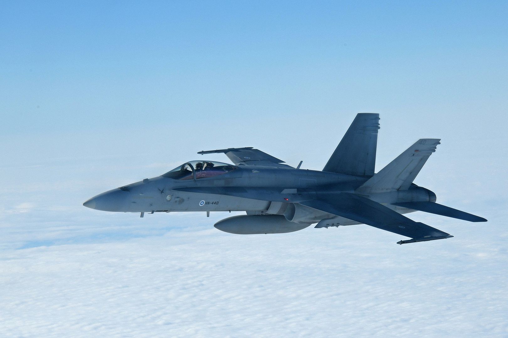 A group of Finnish air force F/A-18C Hornet aircraft fly in formation after receiving fuel from a KC-135 Stratotanker aircraft assigned to the 100th Air Refueling Wing during exercise Baltic Trident over Finland, March 17, 2021. Exercise Baltic Trident is a joint training exercise to ensure Airmen and aircrew are postured to deliver lethal combat power across the spectrum of military operations by utilizing elements of agile combat employment. (U.S. Air Force photos by Tech. Sgt. Anthony Hetlage)