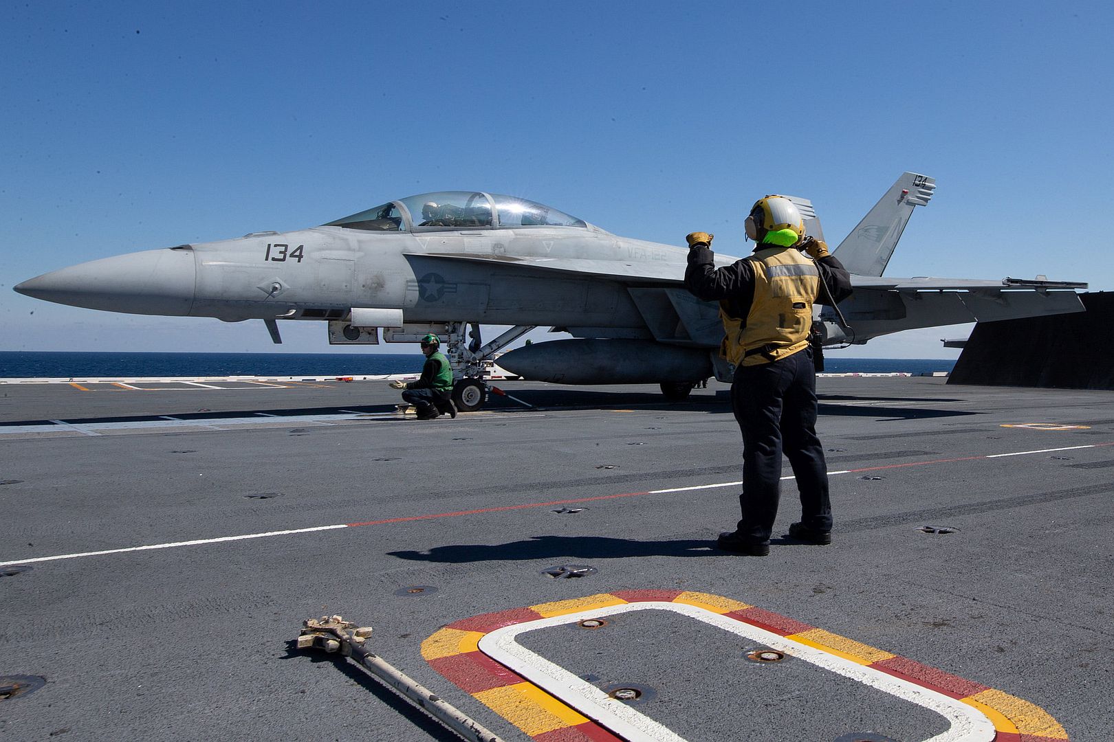 Aviation Boatswain's Mate (Handling) 2nd Class Jynishia Wilson, from Lakeland, Florida, assigned to USS Gerald R. Ford’s (CVN 78) air department, directs an F/A-18F Super Hornet attached to the “Flying Eagles” of Strike Fighter Squadron (VFA) 122, on Ford’s flight deck, March 8, 2021. Ford is underway in the Atlantic Ocean conducting carrier qualifications. (U.S. Navy photo by Mass Communication Specialist Seaman Jackson Adkins)