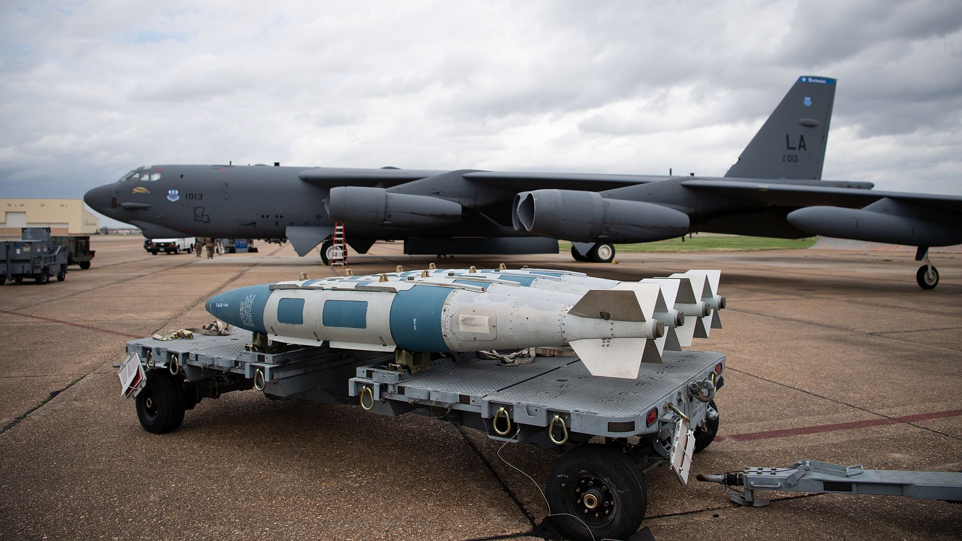 GBU-31 munitions sit in front of a B-52H Stratofortress during Combat Hammer at Barksdale Air Force, La., March 10, 2021. Airmen from the 2nd Bomb Wing flew an impressive eight for eight sortie generation and fly rate, something rarely seen across all combat platforms, not just bombers in support of the exercise. (U.S. Air Force photo by Airman 1st Class Jacob B. Wrightsman)