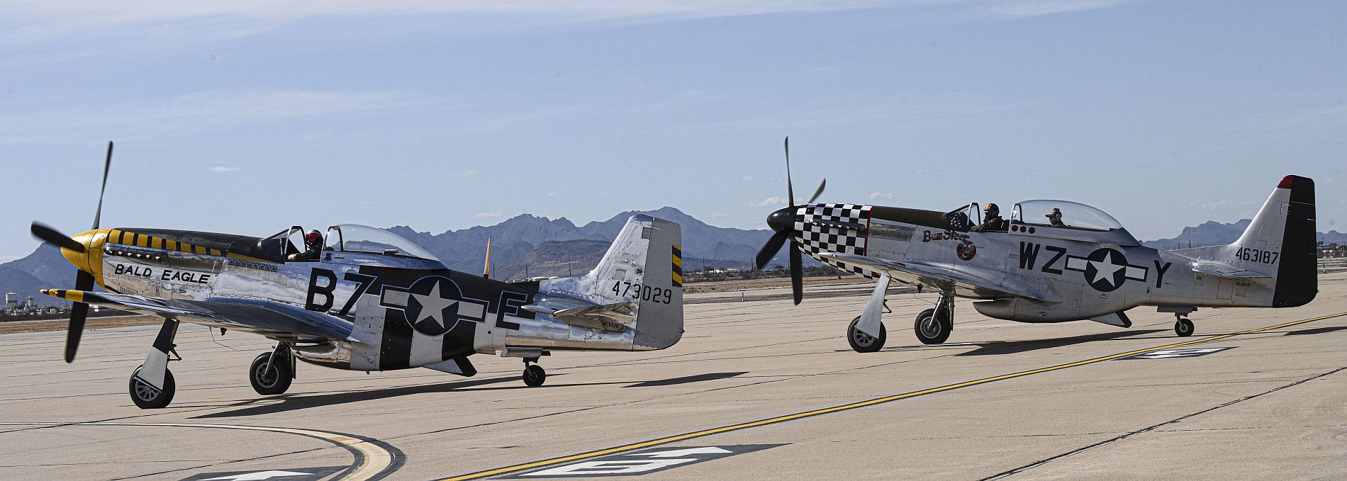 Two U.S. Air Force P-51 Mustangs taxi onto the flight line and prepare to take flight at Davis-Monthan Air Force Base, Arizona, March 7, 2021. The aircraft participating in the 2021 Heritage Flight Training Course include the P-51 Mustang, P-38 Lightning, P-40 Warhawk, P-41 Thunderbolt, F-86 Sabre and the A-1 Skyraider. (U.S. Air Force photo by Airman William Turnbull)