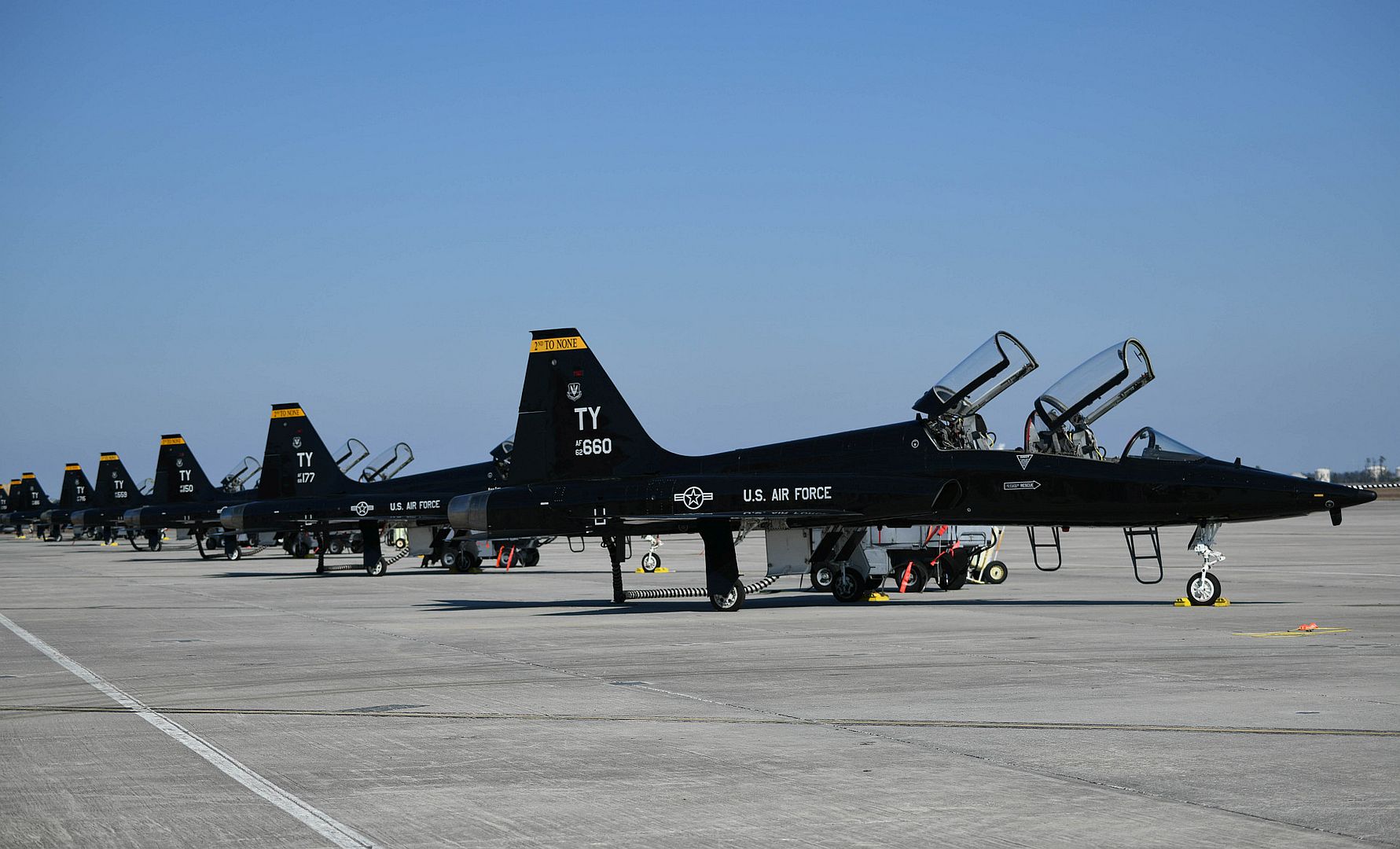 A line of T-38A Talons from the 2nd Fighter Training Squadron sit on the flight line at Tyndall Air Force Base, Florida, March 8, 2021. The 2nd FTS is tasked to provide world class, professional air-to-air threat replication. (U.S. Air Force photo by Airman 1st Class Anabel Del Valle)