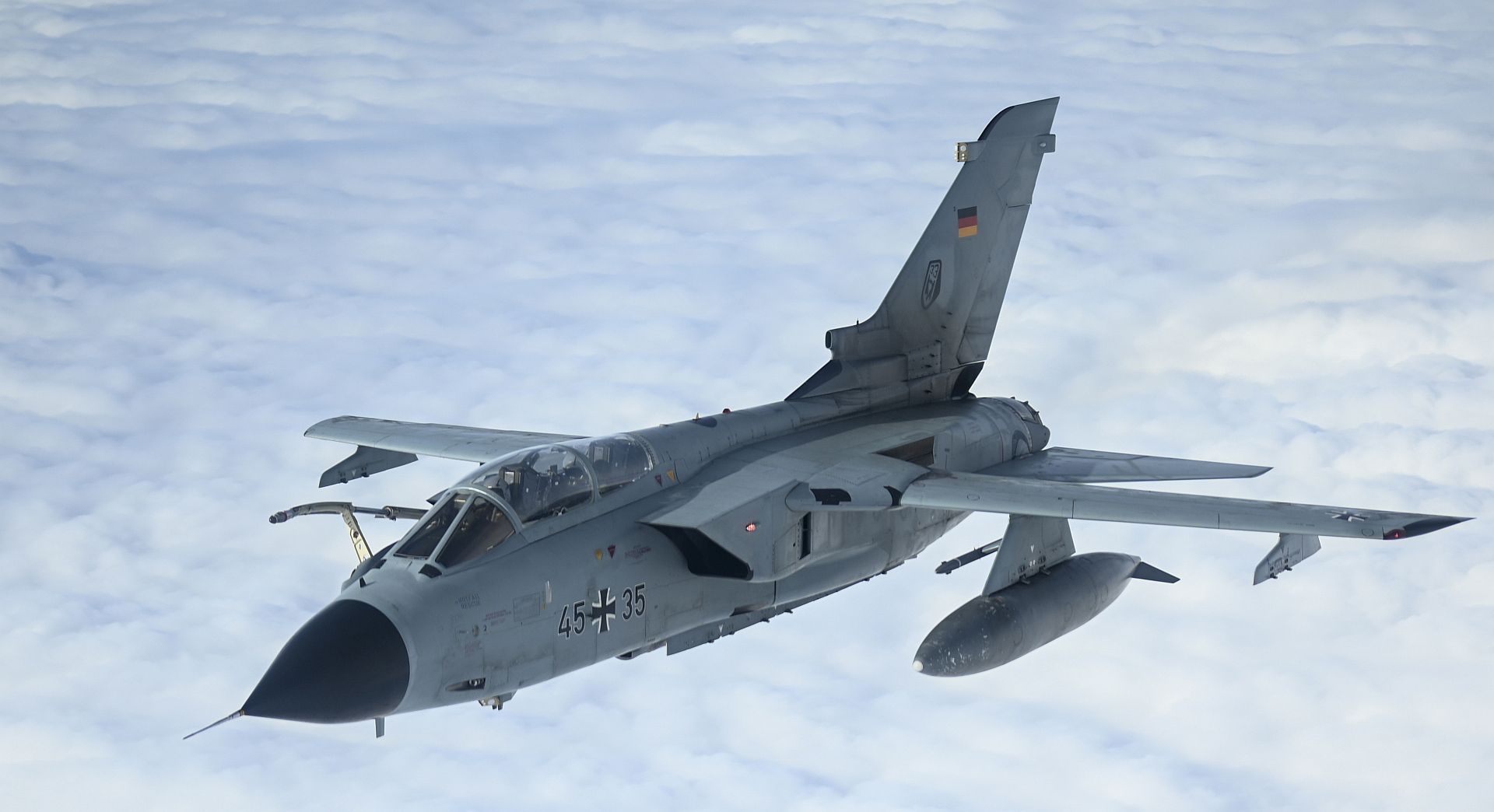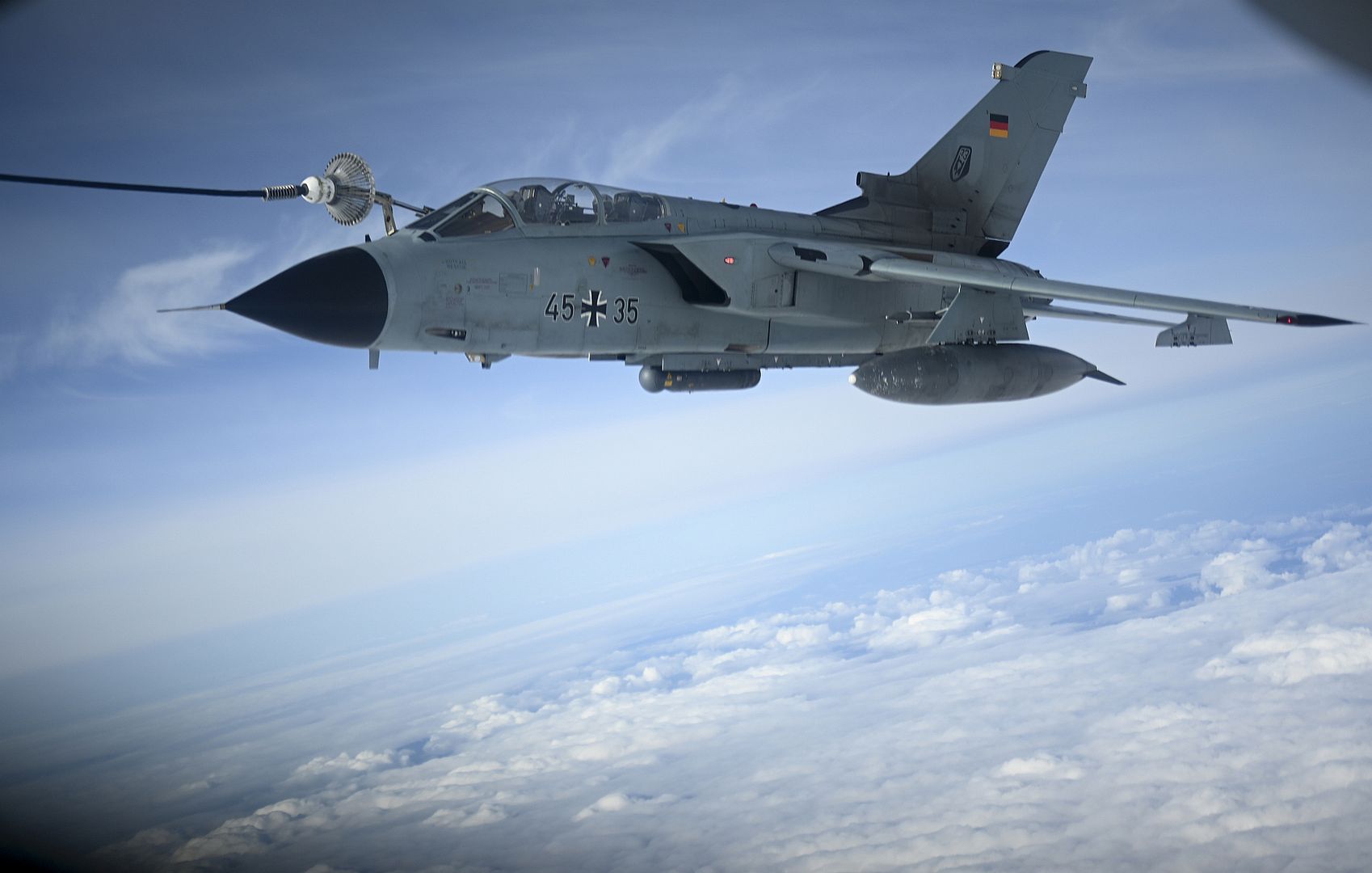 A German air force Tornado aircraft is refueled by a U.S. Air Force KC-135 Stratotanker aircraft assigned to the 100th Air Refueling Wing during exercise Baltic Trident, over Germany, March 18, 2021. Exercise Baltic Trident is an exercise focused on developing the 100th ARW’s agile combat employment concepts. (U.S. Air Force photos by Tech. Sgt. Emerson Nuñez)