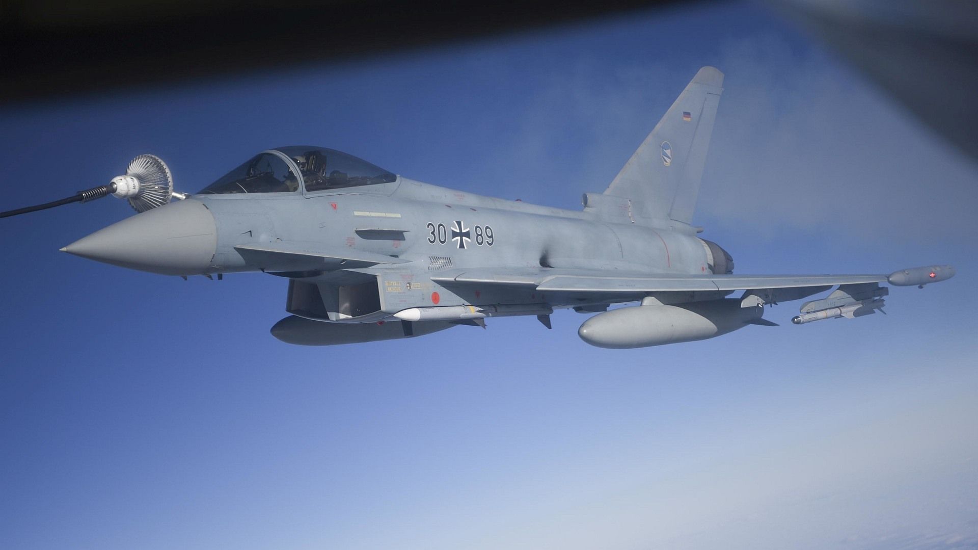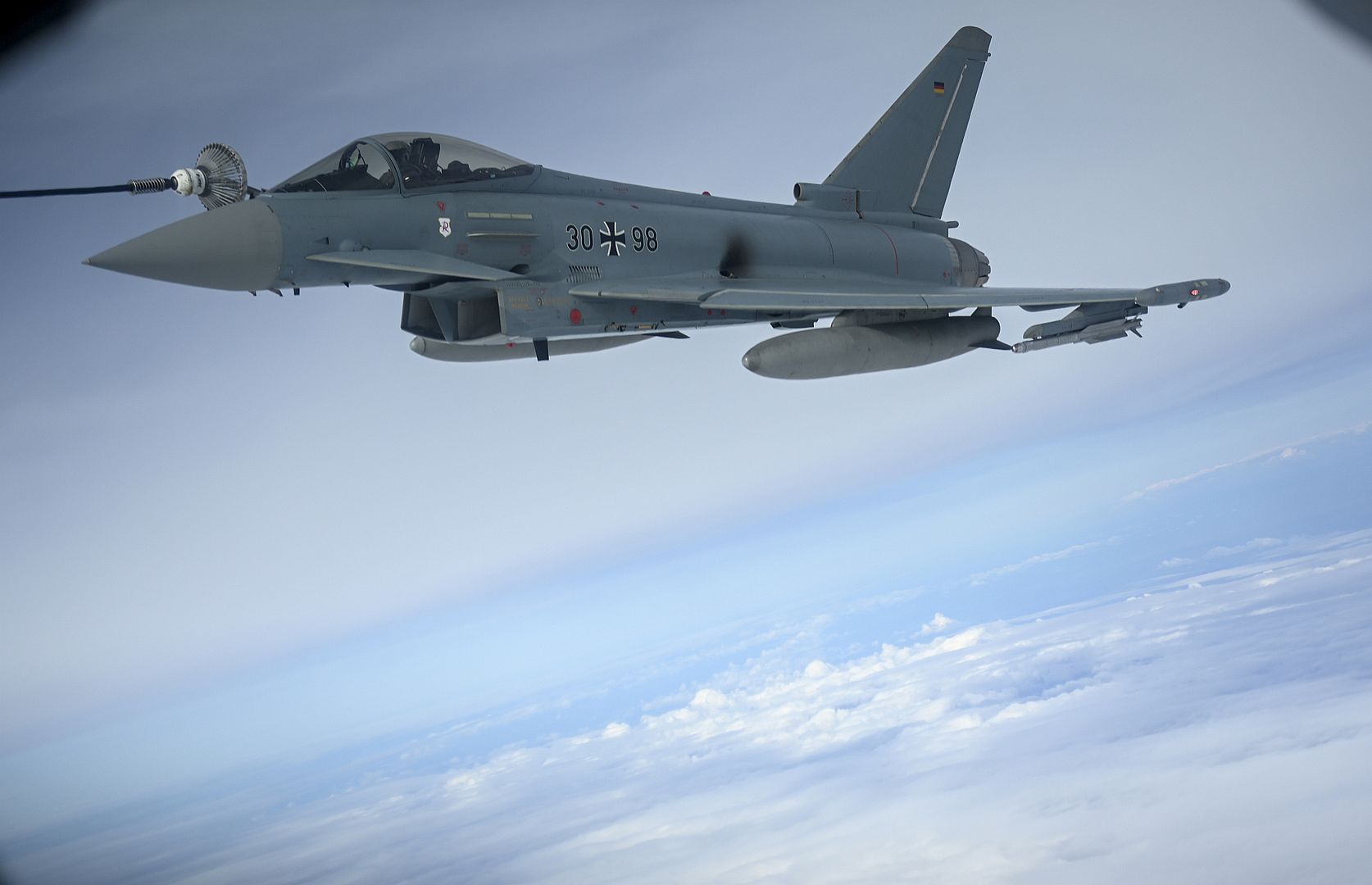 A German air force Eurofighter Typhoon aircraft is refueled by a U.S. Air Force KC-135 Stratotanker aircraft assigned to the 100th Air Refueling Wing during exercise Baltic Trident, over Germany, March 18, 2021. Agile combat employment exercises enable the 100th ARW to become more agile and responsive to better support European partners and allies. (U.S. Air Force photo by Tech. Sgt. Emerson Nuñez)