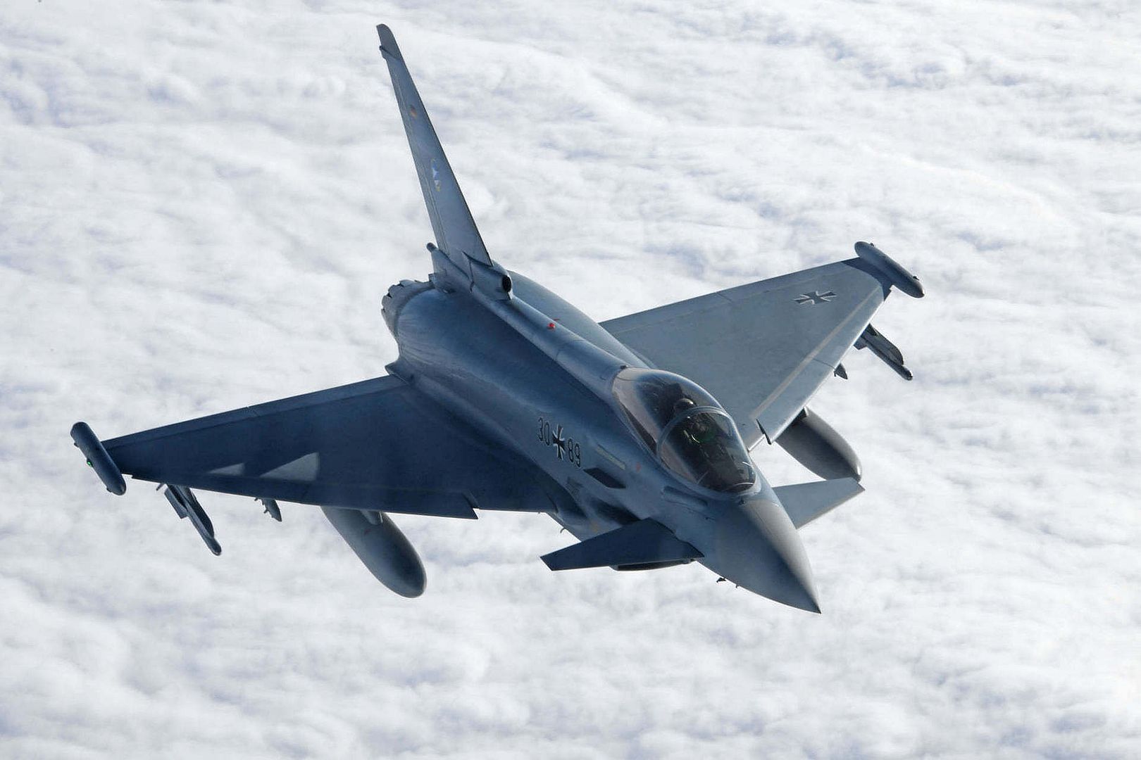 A German air force Eurofighter Typhoon aircraft prepares to receive fuel from a U.S. Air Force KC-135 Stratotanker aircraft assigned to the 100th Air Refueling Wing during exercise Baltic Trident over Estonia, March 16, 2021. Exercise Baltic Trident is a joint training exercise to ensure Airmen and aircrew are postured to deliver lethal combat power across the spectrum of military operations by utilizing elements of agile combat employment. (U.S. Air Force photo by Tech. Sgt. Anthony Hetlage)