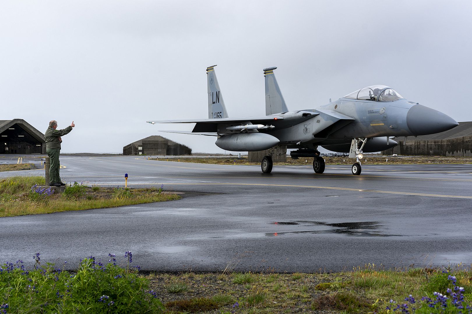 Royal Air Force squadron leader Craig Docker with the combined air operations certification team, gives a thumbs up to a U.S. Air Force F-15C Eagle, assigned to the 493rd Fighter Squadron, during NATO Air Policing certification at Keflavik Air Base, Iceland, July 13, 2021. This year’s mission marks 60 years of NATO Air Policing across Europe and remains a fundamental component of how NATO provides security to its members. (U.S. Air Force photo by Staff Sgt. Rachel Maxwell)