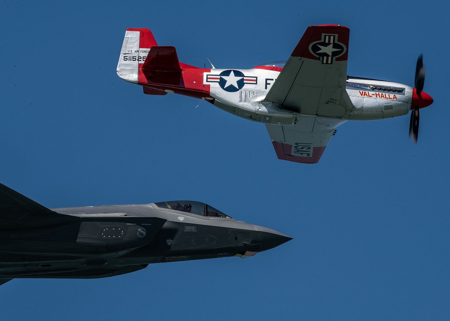 U.S. Air Force Maj. Kristin "BEO" Wolfe, F-35A Lightning II Demonstration Team pilot and commander, flies in formation with retired Lt. Col. Greg Anders, Air Force Heritage Flight Foundation P-51 pilot, over Tacoma's Commencement Bay, July 3, 2021. The F-35 Demo Team headlined both the 2021 Gig Harbor Wings-and-Wheels and Tacoma Freedom Fair air shows for the 4th of July weekend. (U.S. Air Force photos by Capt. Kip Sumner)
