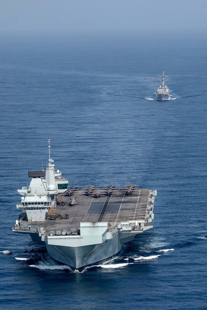 GULF OF ADEN (July 12, 2021) Ships of the UK Carrier Strike Group, USS Ronald Reagan Carrier Strike Group, and Iwo Jima Amphibious Ready Group operate in formation in the Gulf of Aden, July 12. UK, Dutch and U.S. naval forces conducted an integrated at-sea exercise designed to enhance maritime interoperability and demonstrate naval integration through a series of training scenarios. (U.S. Navy photos by Mass Communication Specialist Seaman Gray Gibson)