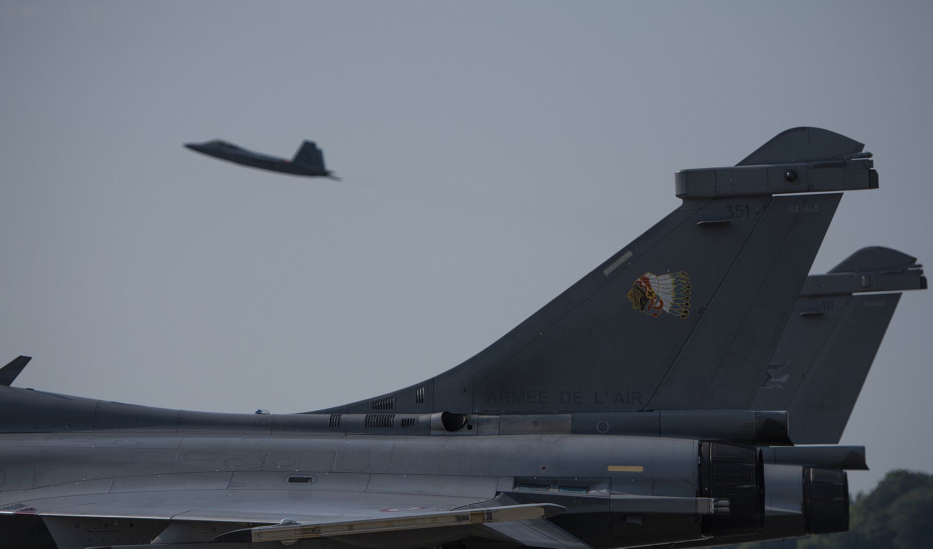 French Air Force Rafales park on the flightline at Joint Base Langley-Eustis, July 6, 2021, while a 1st Fighter Wing F-22 Raptor takes off. (U.S. Air Force photo by Staff Sgt. River Bruce)