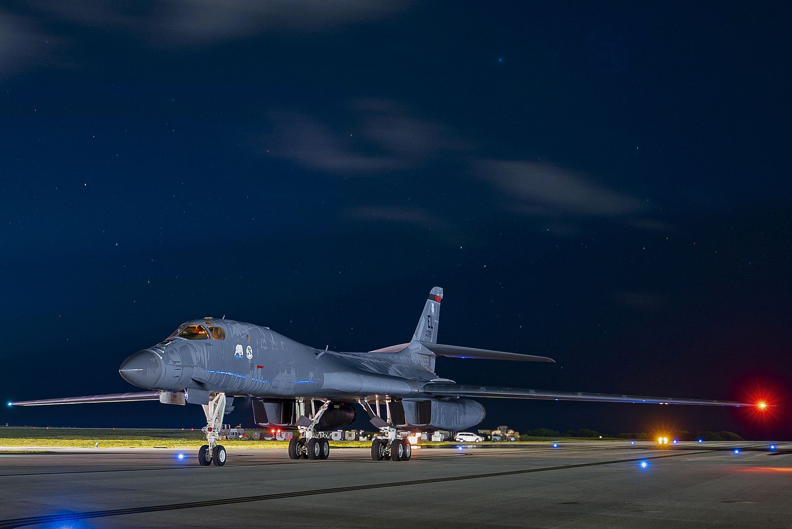A B-1B Lancer aircraft assigned to the 34th Expeditionary Bomb Squadron, Ellsworth Air Force Base, South Dakota, waits to be guided into a parking spot after returning to Andersen Air Force Base, Guam from a Bomber Task Mission, June 8, 2022. Bomber Task Force missions strengthen the collective ability of the U.S. and our allies and partners to maintain a free and open Indo-Pacific. (U.S. Air Force photo by Master Sgt. Nicholas Priest)