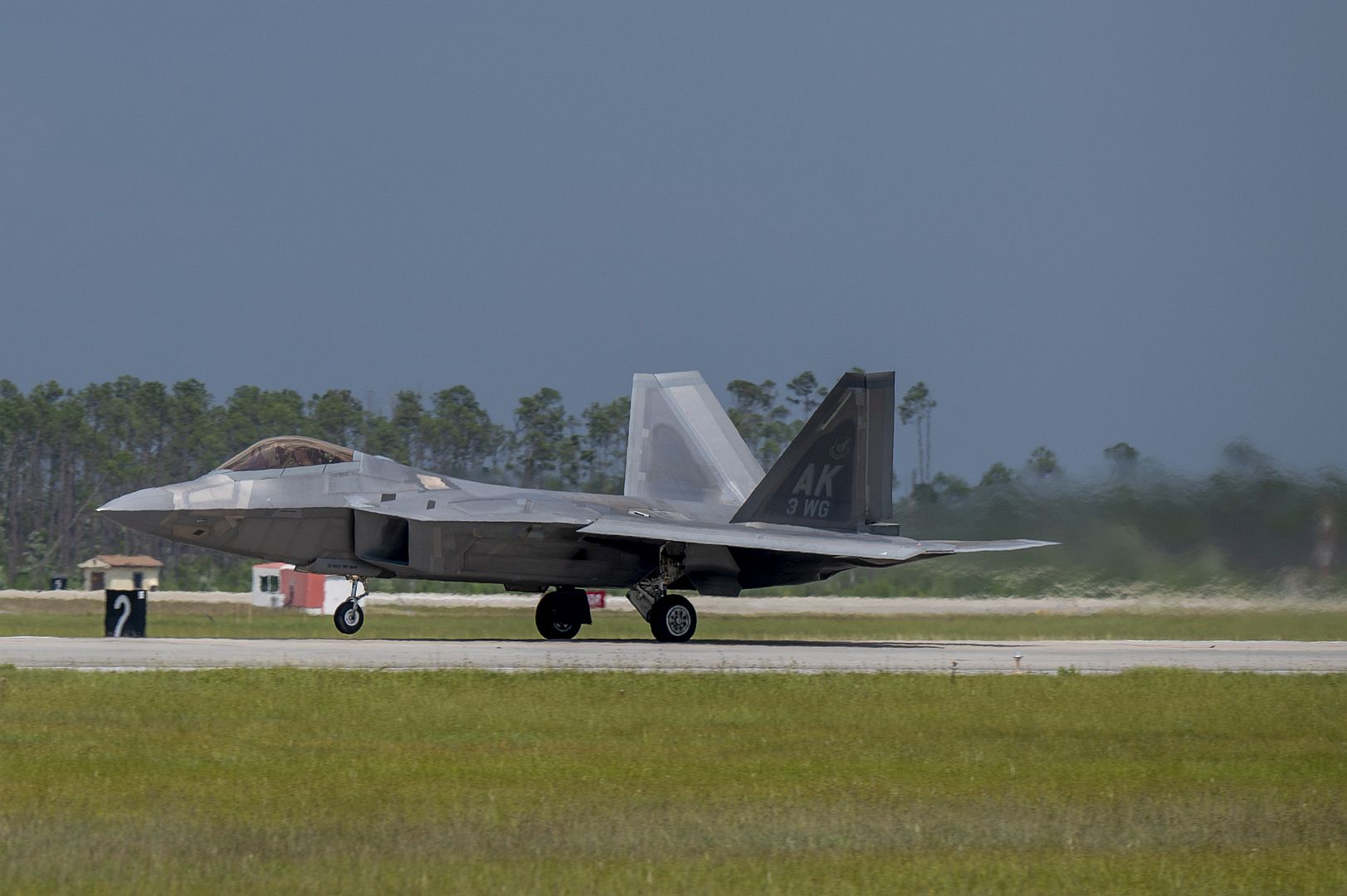 A U.S. Air Force F-22 Raptor assigned to Joint-Base Elmendorf-Richardson, Alaska, takes off during Weapons System Evaluation Program-East 22.08 at Tyndall Air Force Base, Florida, May 17, 2022. WSEP is a formal, two-week evaluation exercise designed to test a squadron’s capabilities to conduct live-fire weapons systems during air-to-air combat training missions. (U.S. Air Force photo by Tech. Sgt. Betty R. Chevalier)