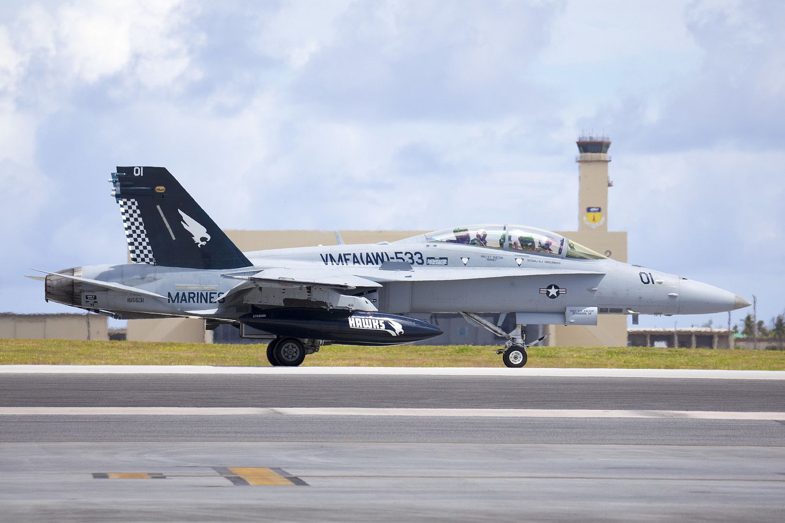 A U.S. Marine Corps F/A-18D Hornet aircraft with Marine All Weather Fighter Attack Squadron (VMFA(AW)) 533 taxis the flight line at Andersen Air Force Base, Guam, June 7, 2022. Marines with VMFA(AW)-533 traveled from Marine Corps Air Station Iwakuni, Japan to Andersen Air Force Base, Guam to enhance squadron readiness and conduct joint-level training as part of an Aviation Training Relocation Program. (U.S. Marine Corps photo by Cpl. Tyler Harmon)