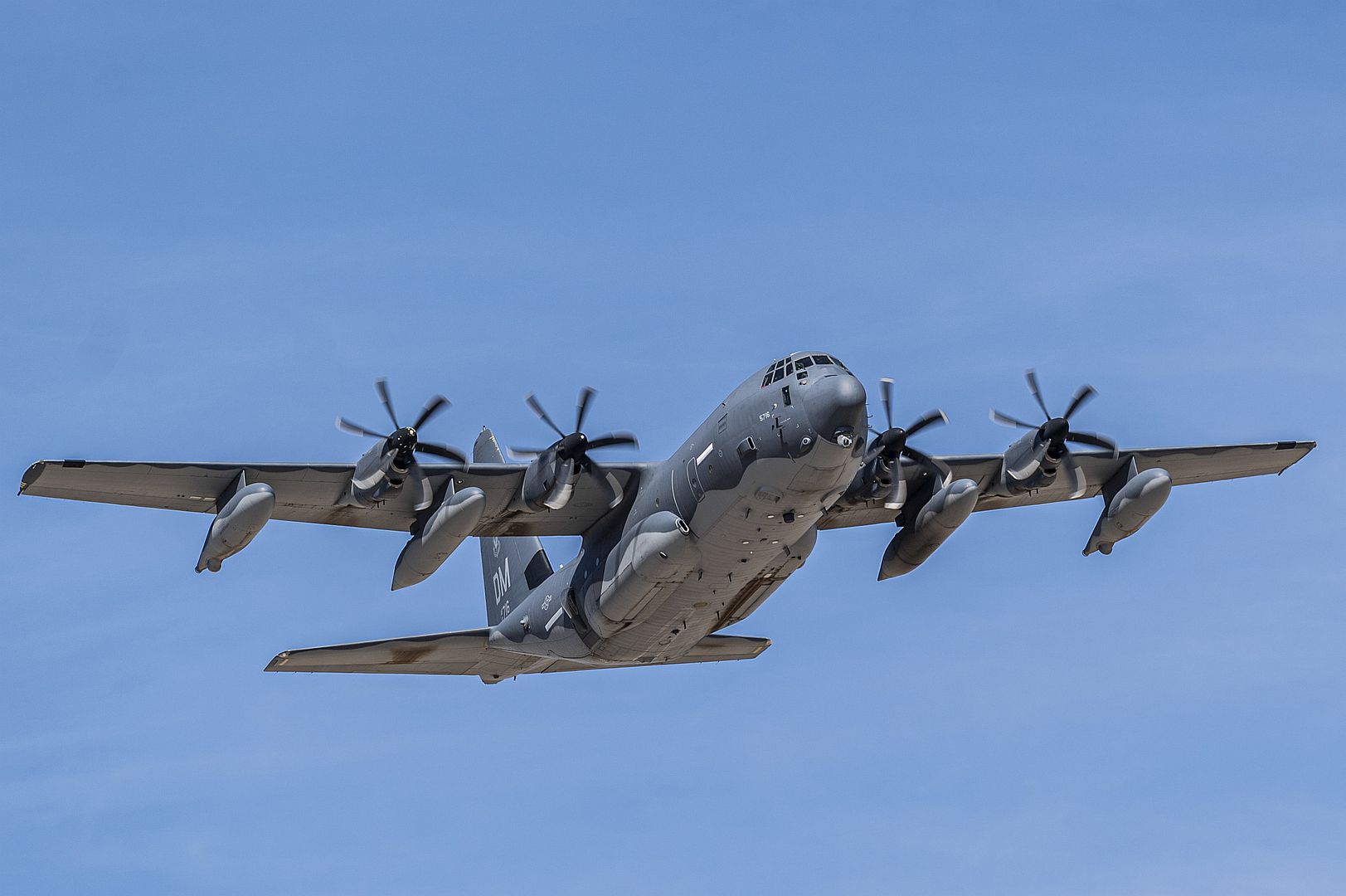 A U.S. Air Force HC-130J Combat King II, assigned to the 79th Rescue Squadron, flies over Davis-Monthan Air Force Base, Arizona, June 7, 2022. Members with the 355th Wing returned home on two C-130s after a six-month overseas deployment. (U.S. Air Force photo by Senior Airman Kaitlyn Ergish)
