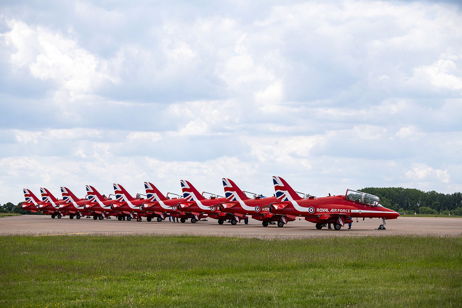 The Royal Air Force aerobatic team aircraft, known as the Red Arrows, park on the flightline at RAF Fairford, England, June 2, 2022. The Red Arrows landed at Fairford to refuel in preparation for the Queen’s Platinum Jubilee Ceremonies and Midlands Air Festival. (U.S. Air Force photo by Staff Sgt. Eugene Oliver)