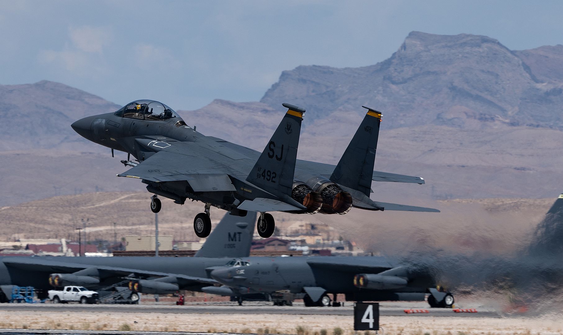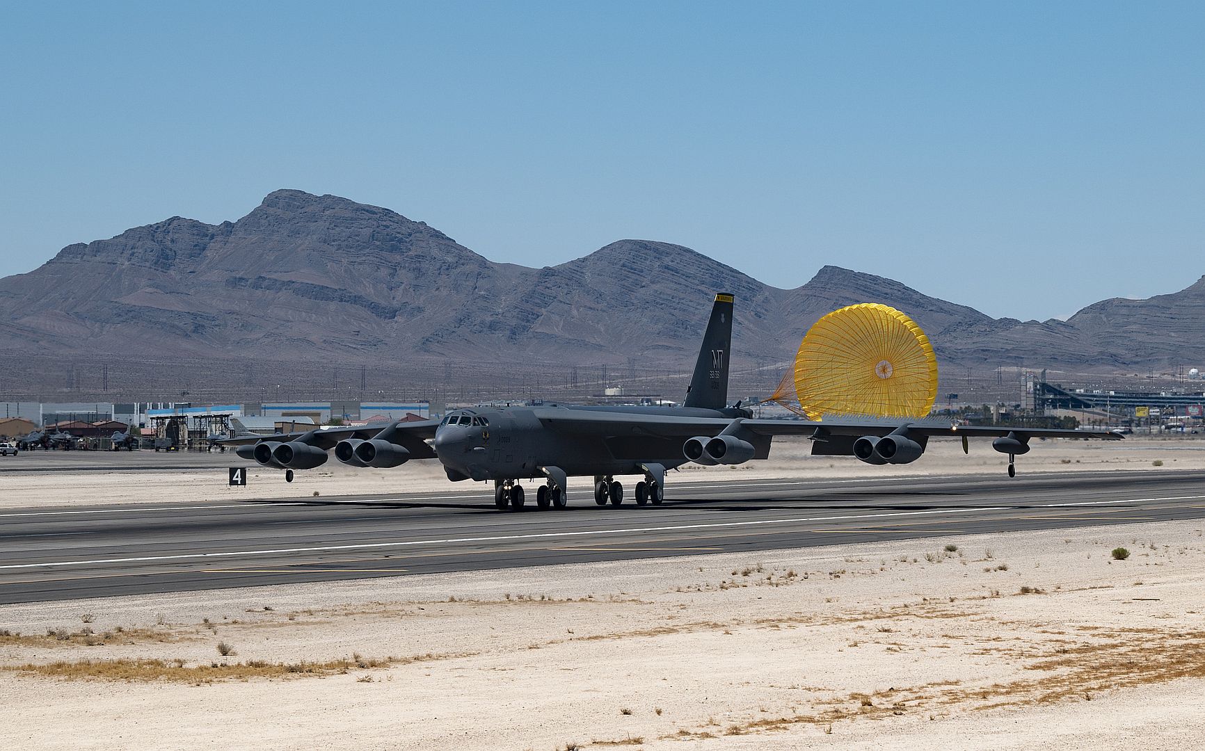 A B-52 Stratofortress assigned to the 5th Bomb Wing, Minot Air Force Base, North Dakota, lands at Nellis Air Force Base, Nevada, July 11, 2022. Participants conduct a variety of scenarios, including defensive counter air, offensive counter air suppression of enemy air defenses and offensive counter air-air interdiction. (U.S. Air Force photo by William R. Lewis)