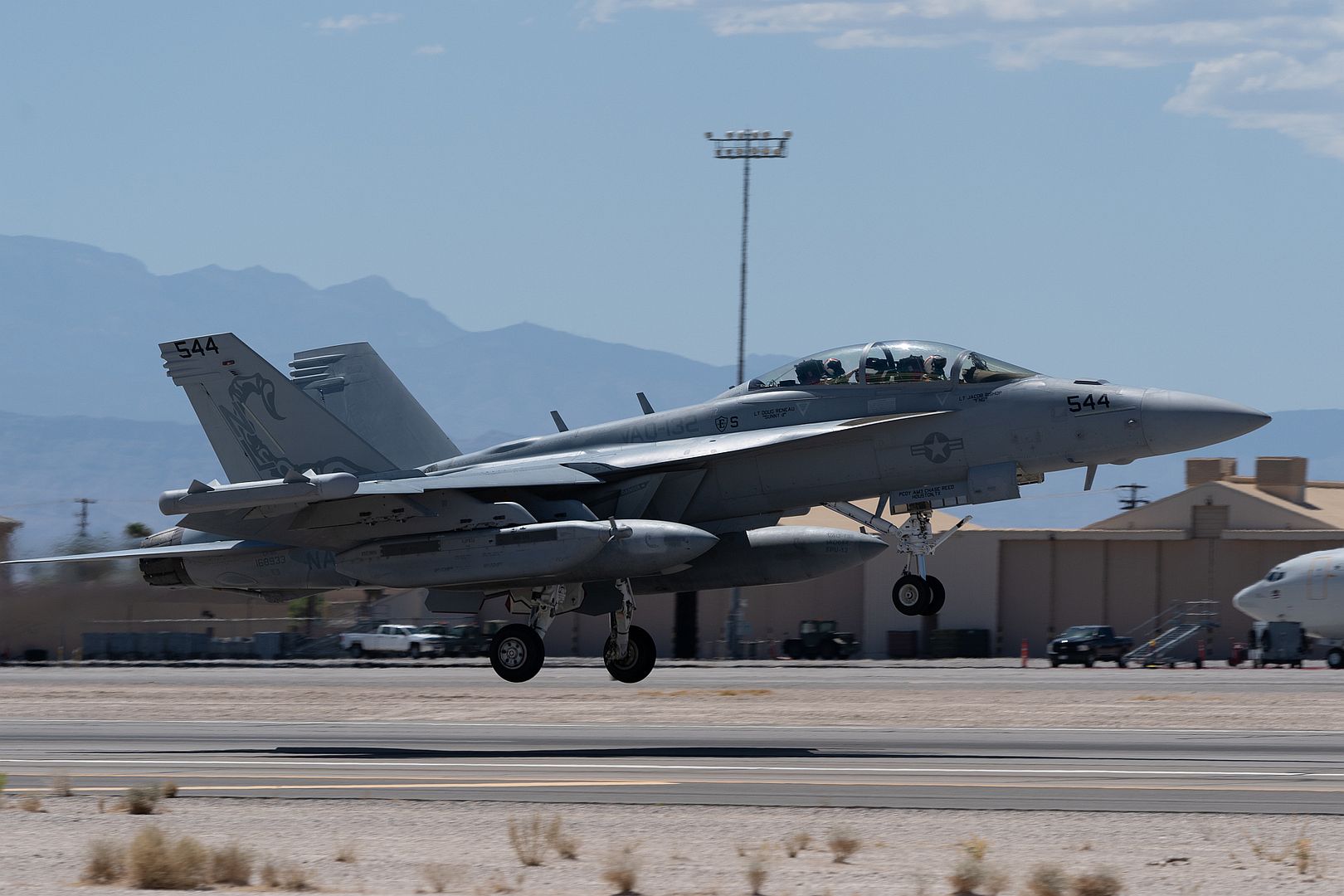 An EA-18G Growler assigned to the VAQ-132 Electronic Attack Squadron, Whidbey Island Naval Air Station, takes off during Red Flag-Nellis 22-3 at Nellis Air Force Base, Nevada, July 11, 2022. RF-N 22-3 includes more than 17 units and approximately 2,000 participants. (U.S. Air Force photo by Airman 1st Class Josey Blades)