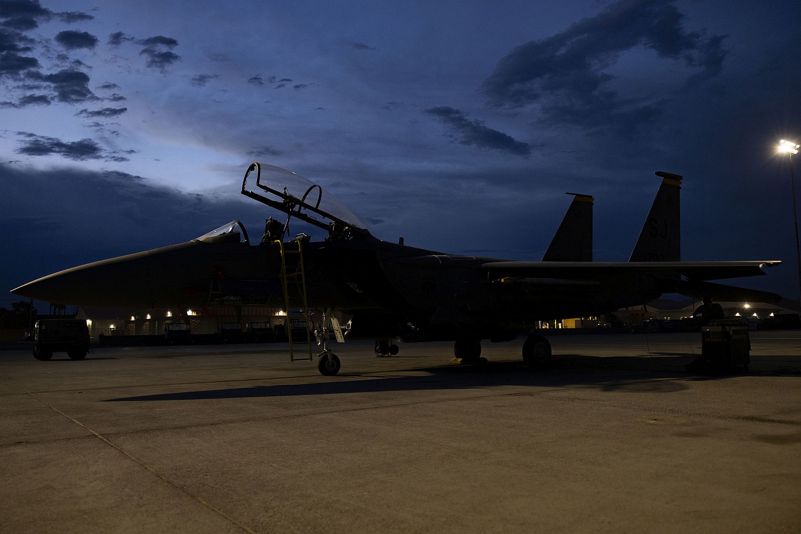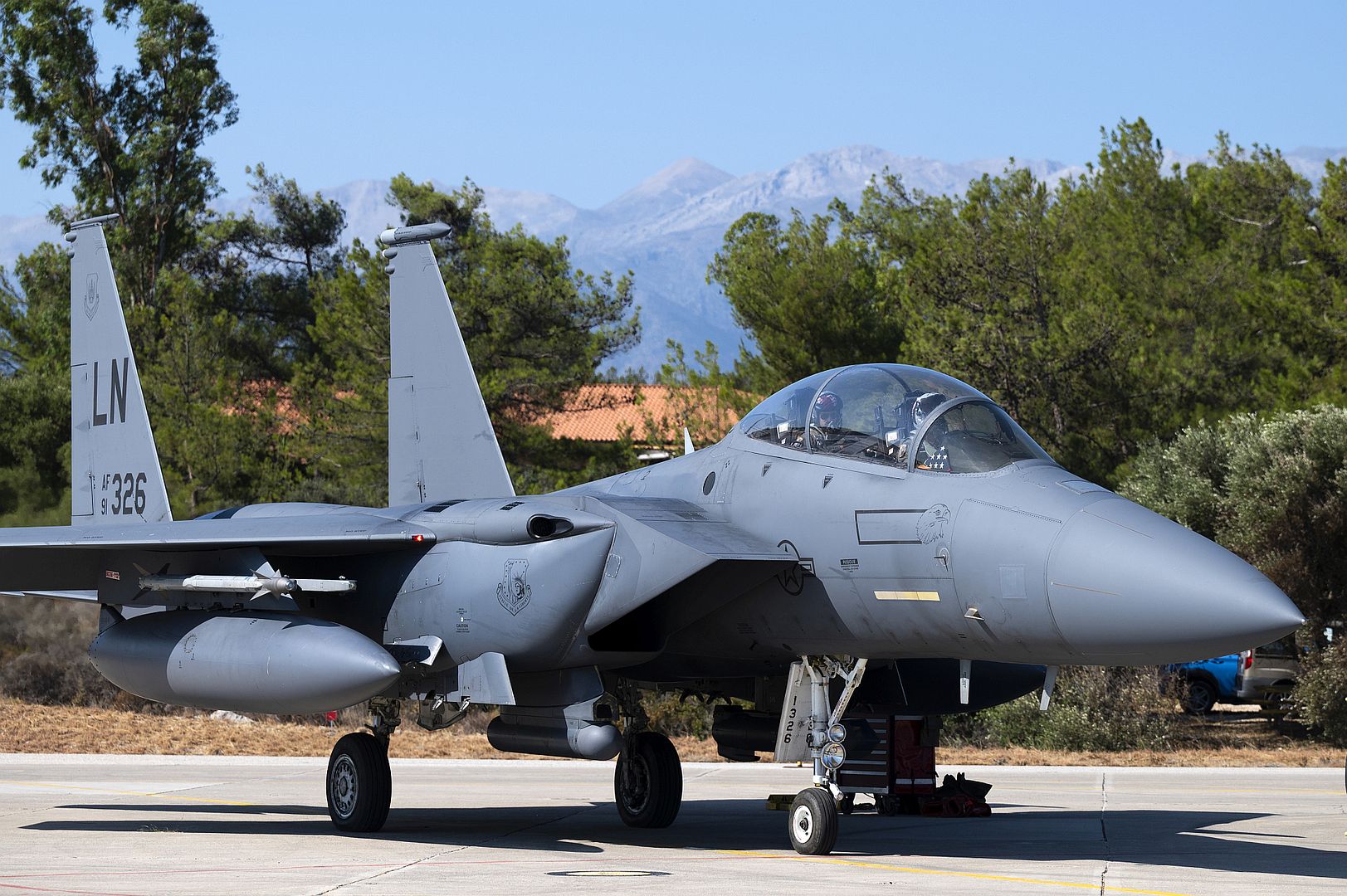An F-15E Strike Eagle assigned to the 336th Fighter Generation Squadron sits on the flight line during Red Flag-Nellis 22-3 at Nellis Air Force Base, Nevada, July 18, 2022. RF-N 22-3 provides realistic combat training that saves lives while increasing combat effectiveness. (U.S. Air Force photo by Senior Airman Zachary Rufus)