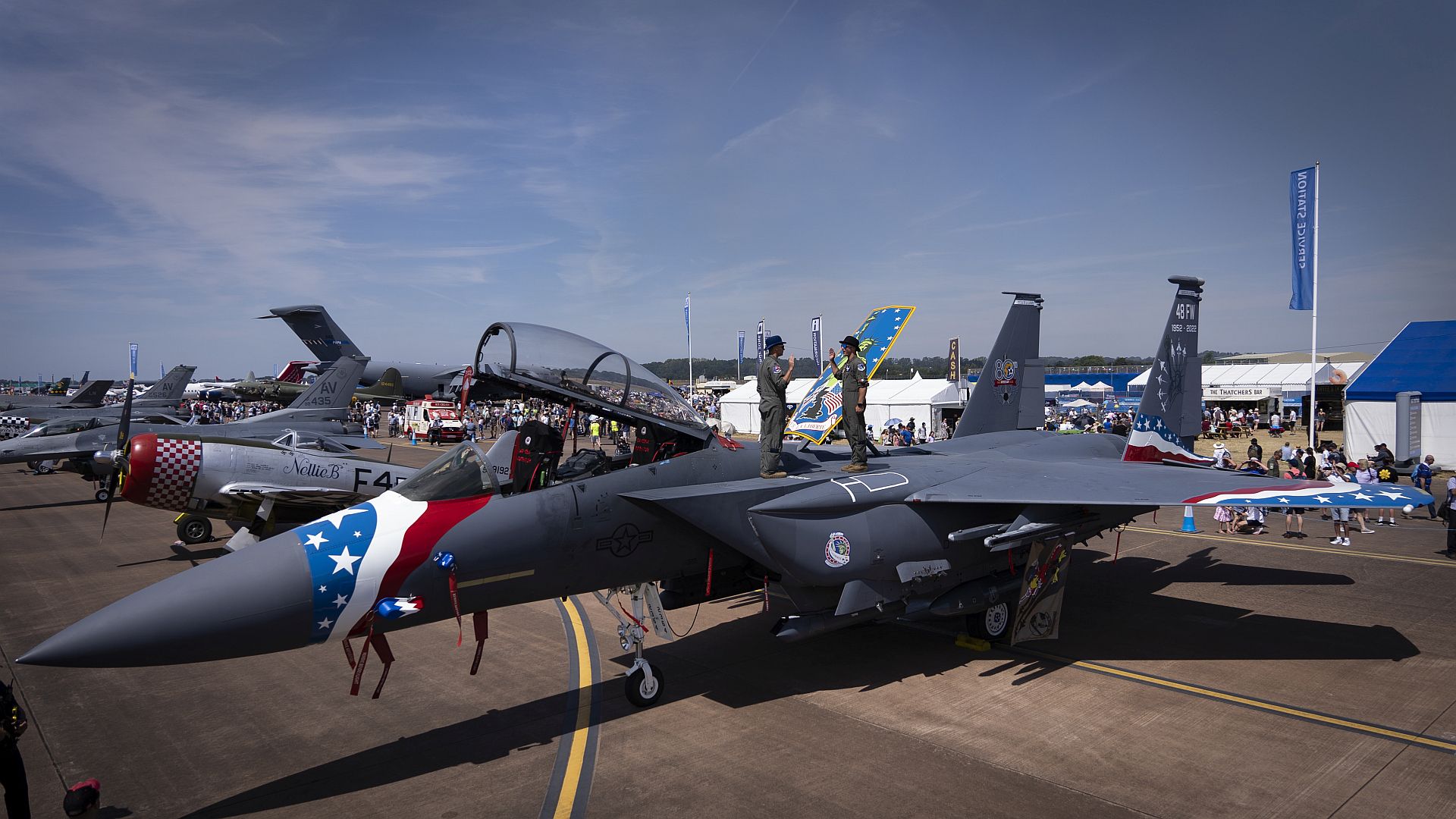 U.S. Air Force corrosion control Airmen assigned to the 48th Fighter Wing equipment maintenance squadron complete pose for a group photo in front of the new F-15E Strike Eagle heritage aircraft at Royal Air Force Lakenheath, England, July 12, 2022. The heritage paint took 19 Airmen 14 working days to complete. (U.S. Air Force Photos by Airman Austin Salazar)
