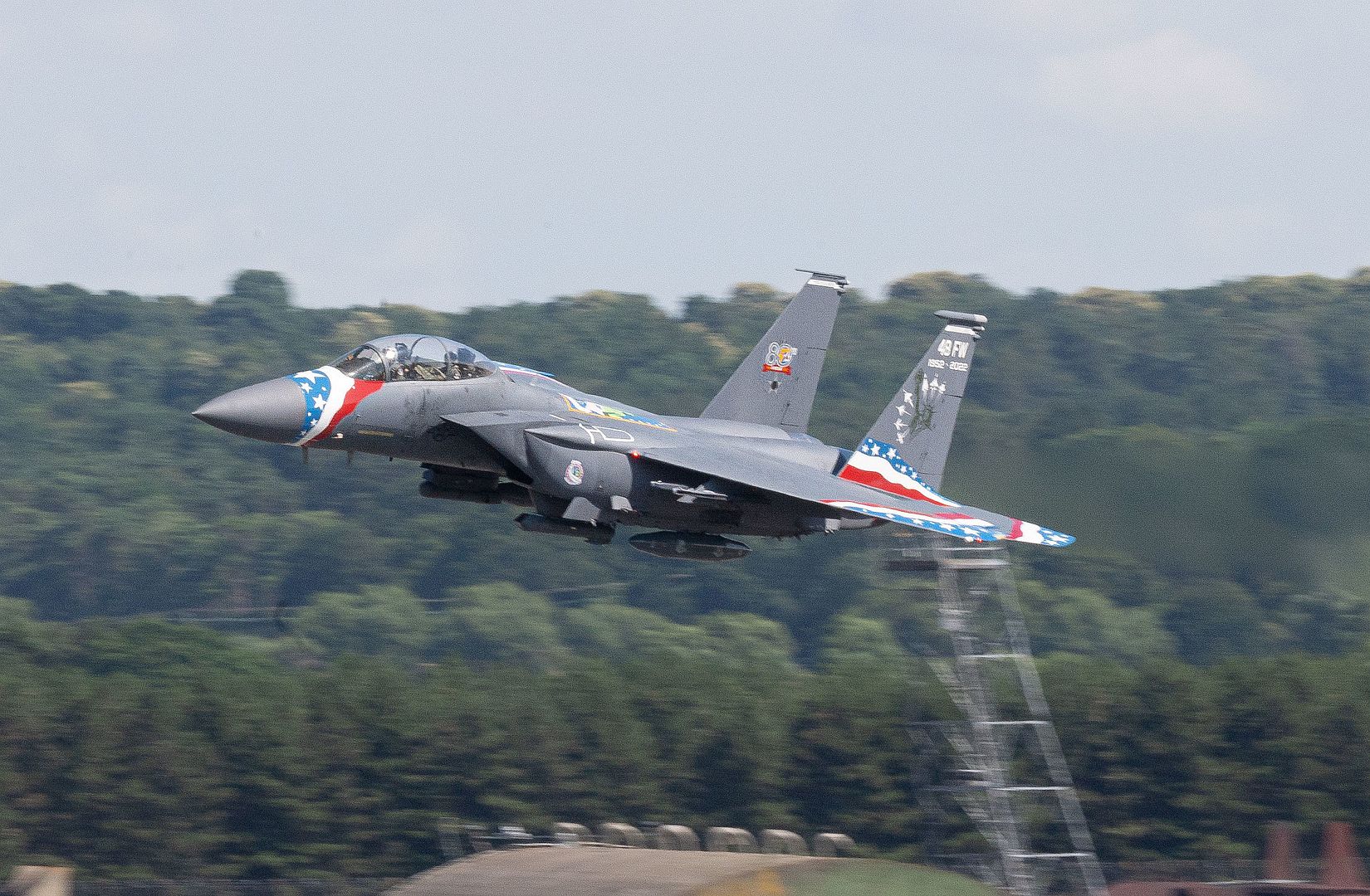 A U.S. Air Force F-15E Strike Eagle assigned to the 48th Fighter Wing takes off in heritage colors at Royal Air Force Lakenheath, England, July 14, 2022. The 75 painted on the tail represents the 75 years of the U.S. Air Force and the Statue of Liberty stands for the 70 years of RAF Lakenheath. (U.S. Air Force Photo by Airman 1st Class Jacob Wood)