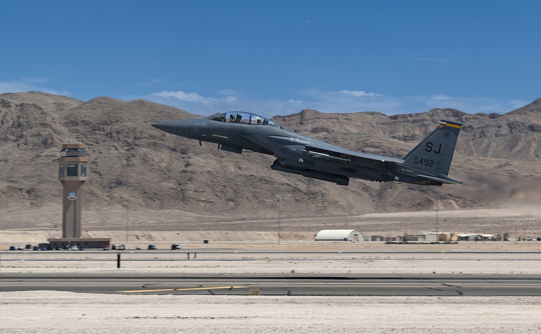 An F-15E Strike Eagle assigned to the 4th Fighter Wing, Seymour Johnson Air Force Base, North Carolina, takes off for a mission at Nellis Air Force Base, Nevada, July 11, 2022. Participants conducting training missions during Red Flag-Nellis 22-3 are able to test and perfect Agile Combat Employment operating concept for how the U.S. combat forces will fight in a modern, contested environment. (U.S. Air Force photo by William R. Lewis)