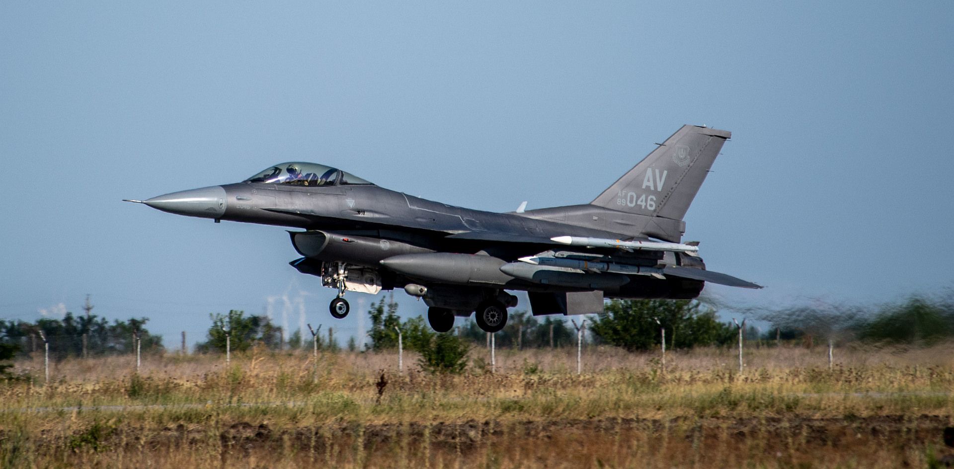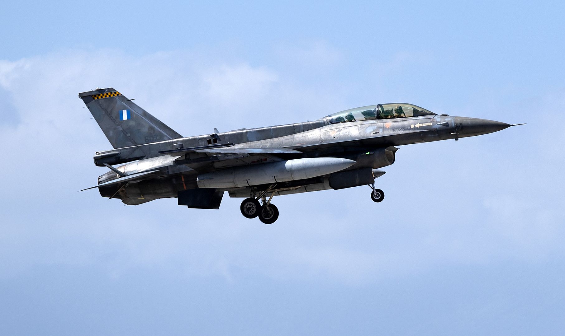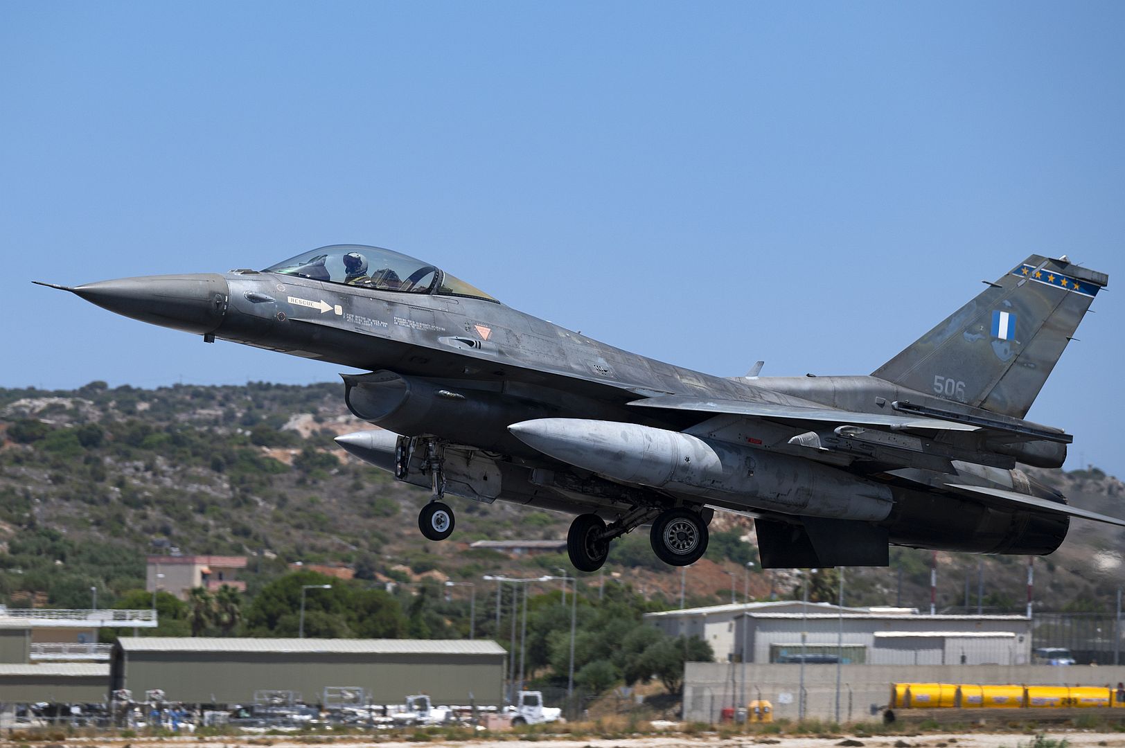 A Hellenic Air Force F-16D Fighting Falcon assigned to the 115 Combat Wing, prepares to land during exercise Poseidon’s Rage 22 at Souda Air Base, Greece, July 20, 2022. The U.S. Air Force’s bilateral integration with NATO allies during exercises helps to bolster the alliance, by exchanging best practices, improving readiness and interoperability. (U.S. Air Force photo by Tech. Sgt. Rachel Maxwell)