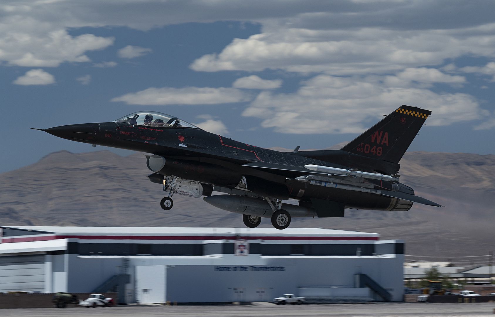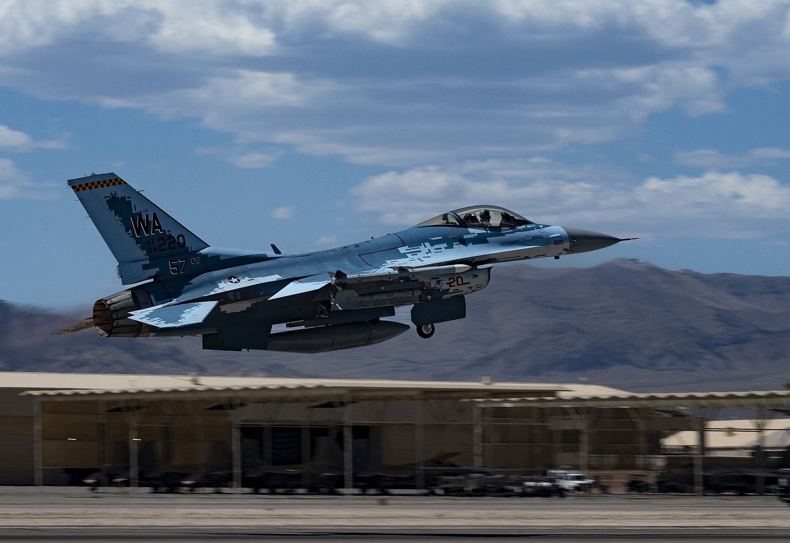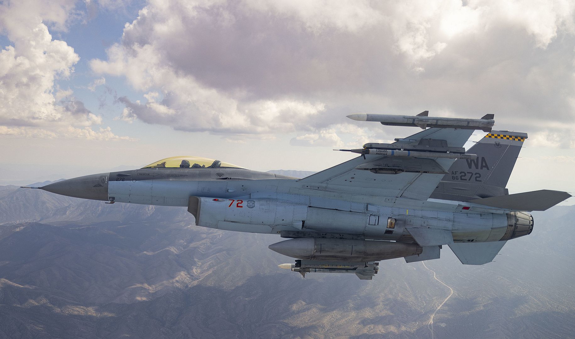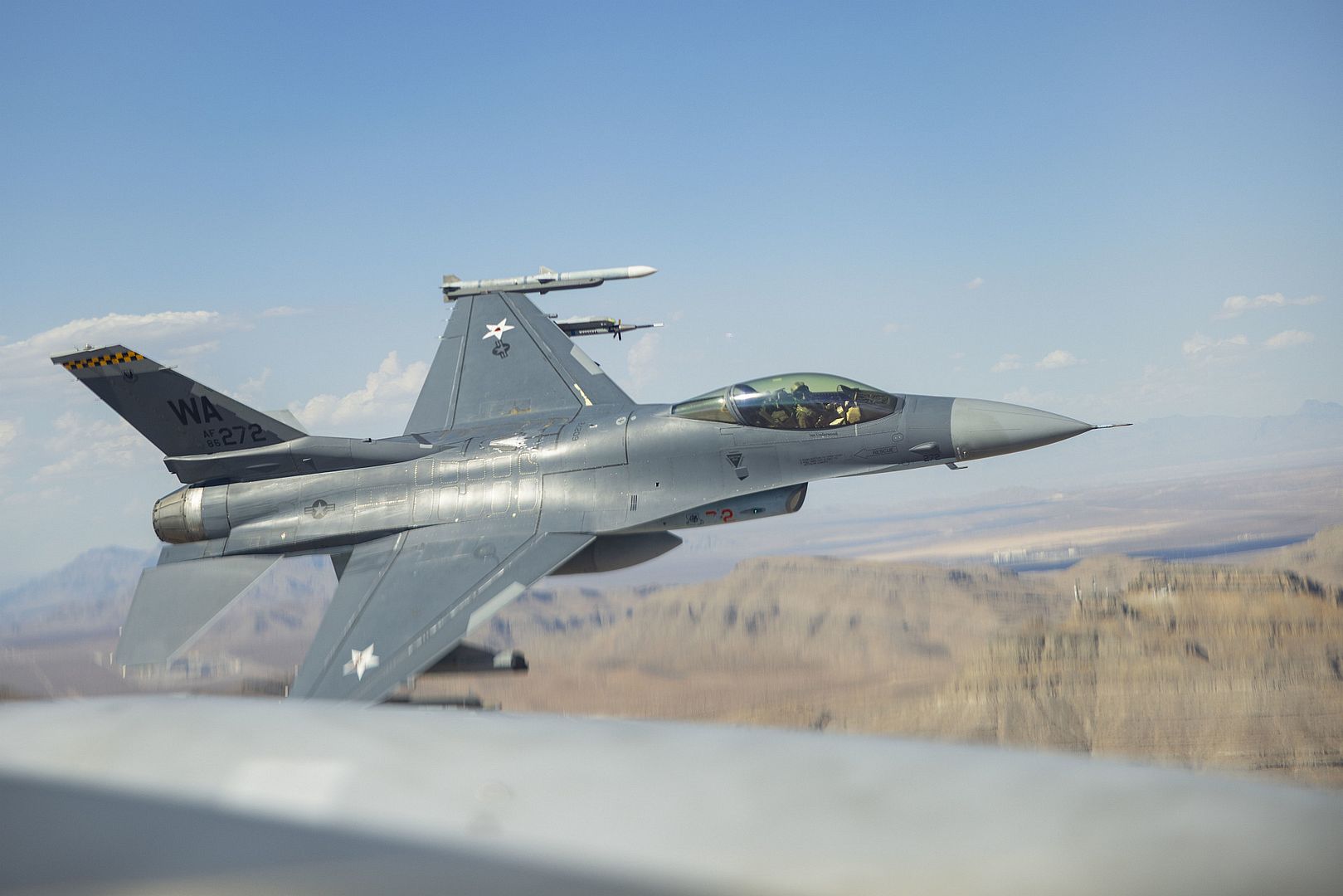 Main AdminAn F-16 Fighting Falcon piloted by Captain Tim “REEF” Joubert, instructor pilot assigned to the 64th Aggressor Squadron, flies over the Nevada Test and Training Range after participating in a Red Flag-Nellis 22-3 mission at Nellis Air Force Base, July 12, 2022. The Nevada Test and Training Range is the U.S. Air Force’s premier military training area with more that 12,000 square miles of air space and 2.9 million acres of land. (U.S. Air Force photos by Senior Airman Zachary Rufus)
