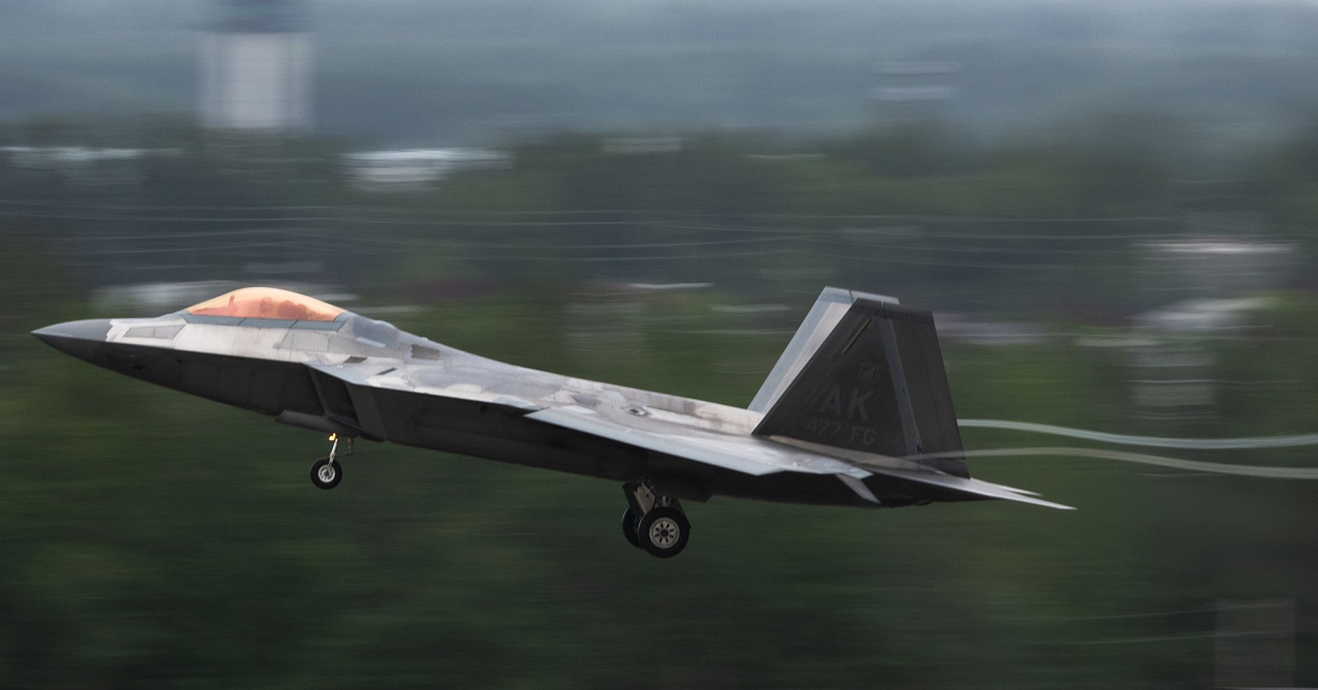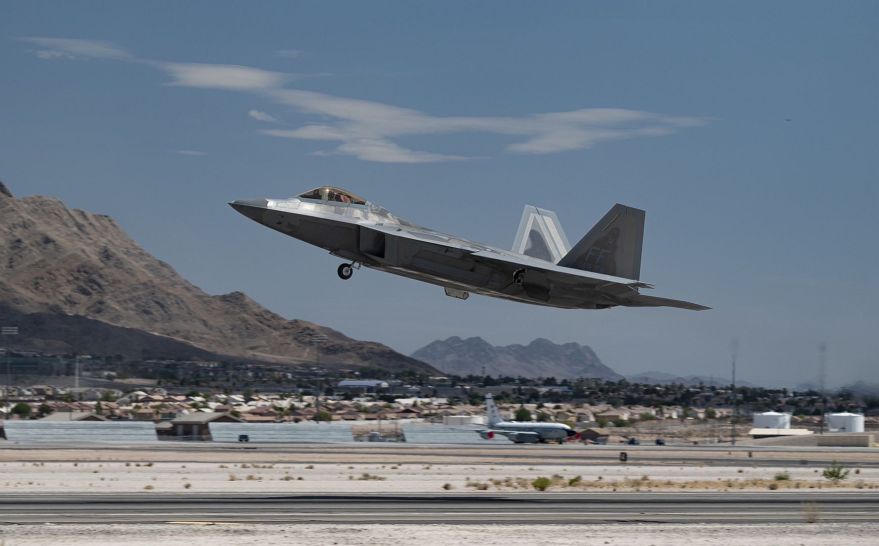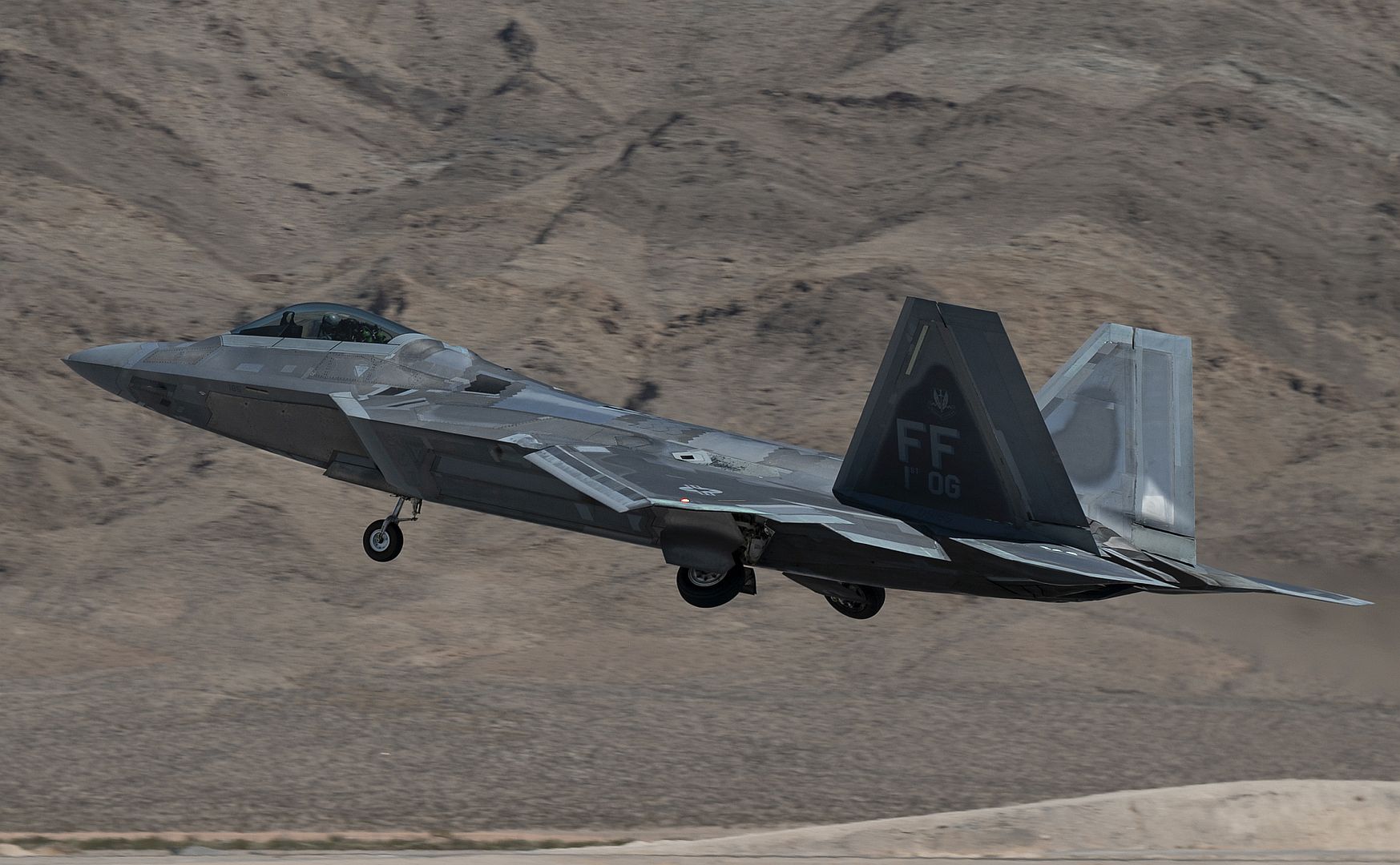 An F-22 Raptor assigned to the 27th Fighter Squadron, Langley Air Force Base, Virginia, takes off during Red Flag-Nellis 22-3 at Nellis Air Force Base, Nevada, July 11, 2022 Blue Force teams participating in RF-N 22-3 will consist of the most advanced fifth-generation, long range targeting aircraft and space assets yet. (U.S. Air Force photo by Airman 1st Class Josey Blades)