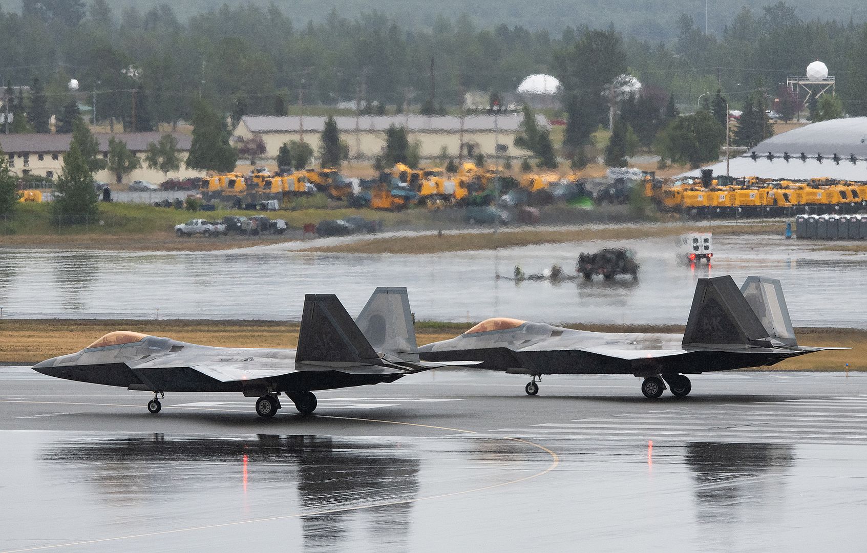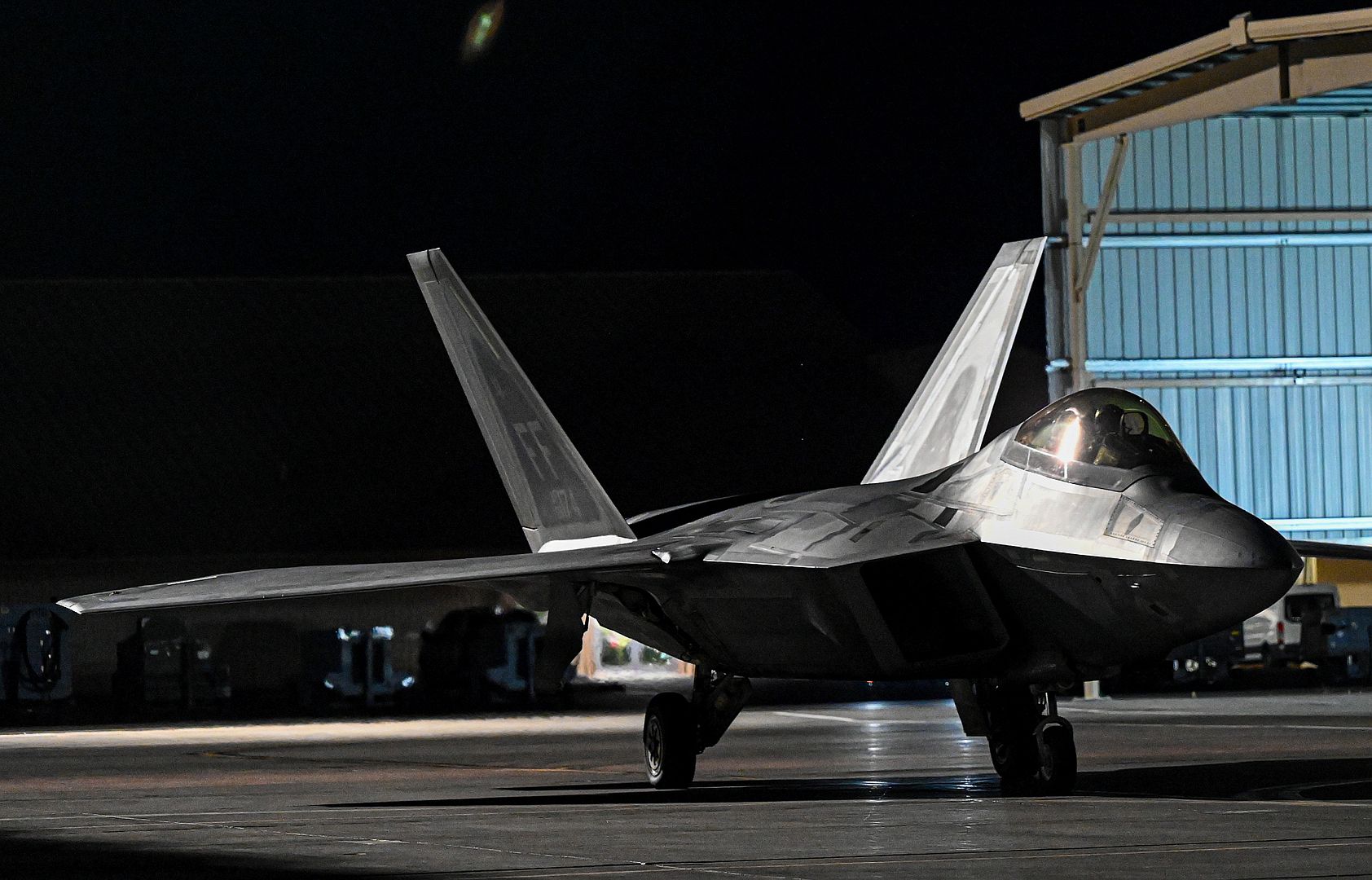 An F-22 Raptor taxis on the flightline during a Red Flag night operation at Nellis Air Force Base, Nevada, July 13, 2022. The 1st Fighter Wing is s America’s first wing and defends their legacy by enabling their Warfighters to maintain air combat readiness and protect the Joint Force by training at Red Flag 22-3. (U.S. Air Force photo by Airman 1st Class Mikaela Smith)