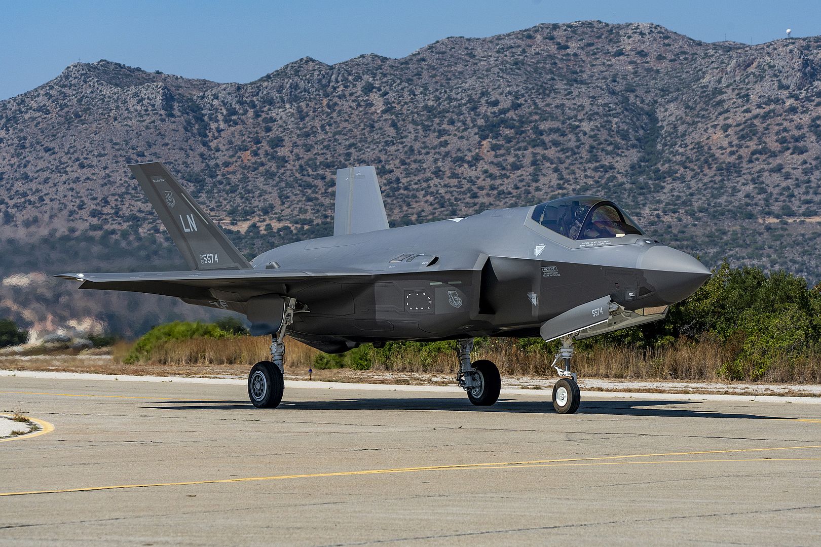 Main AdminA U.S. Air Force F-35A Lightning II assigned to the 495th Fighter Squadron taxis ahead of a training mission, while a Hellenic Air Force F-16 Fighting Falcon takes off, during exercise Poseidon’s Rage 22, at Souda Air Base, Greece, July 11, 2022. PR22 is designed to bolster readiness and interoperability between the USAF and HAF by demonstrating localized air superiority through the incorporation of both live and inert munitions. (U.S. Air Force photo by Tech Sgt. Dhruv Gopinath)