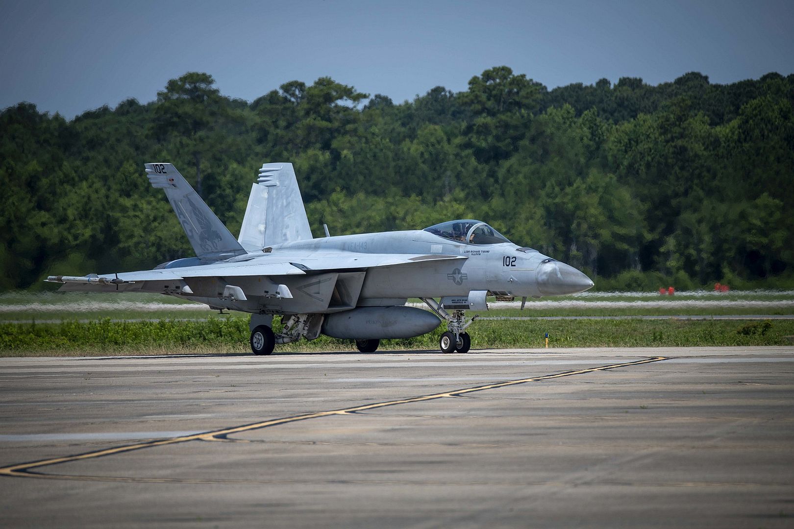 VIRGINIA BEACH, Va. (Ju1. 13, 2022) An F/A-18E Super Hornet, attached to the “Pukin Dogs” of Strike FIghter Squadron (VFA) 143, taxis on the flightline onboard Naval Air Station Oceana. The squadron is attached to Carrier Air Wing SEVEN based at Naval Air Station Oceana. (U.S. Navy photo by Mass Communication Specialist 2nd Class Megan Wollam/Released)