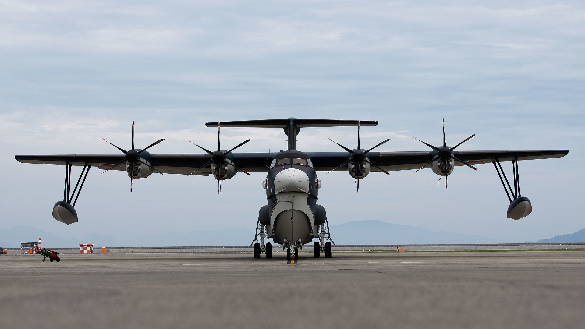 A Japanese ShinMaywa US-2 awaits visitors at Marine Corps Air Station Iwakuni, Japan, July 8, 2022. The US-2 is an amphibious aircraft designed for personnel rescue and contingency response. (U.S. Air Force photo by Senior Airman Gary Hilton)
