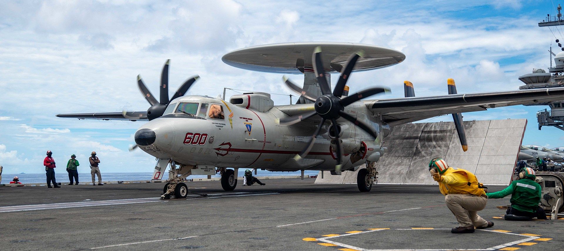 PHILIPPINE SEA (Aug. 2, 2022) Capt. Fred Goldhammer, commanding officer of the U.S. Navy’s only forward-deployed aircraft carrier USS Ronald Reagan (CVN 76), launches from the flight deck in an E-2D Hawkeye attached to the Tigertails of Airborne Early Warning Squadron (VAW) 125 in the Philippine Sea, Aug. 2. E-2D Hawkeyes perform tactical airborne early warning missions to provide valuable information to Carrier Strike Group 5 as it plans and executes operations. Ronald Reagan, the flagship of Carrier Strike Group 5, provides a combat-ready force that protects and defends the United States, and supports alliances, partnerships and collective maritime interests in the Indo-Pacific region. (U.S. Navy photo by Mass Communication Specialist 3rd Class Gray Gibson)
