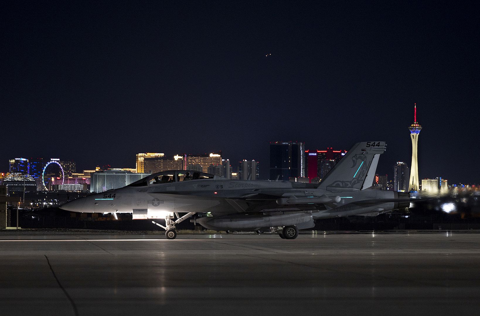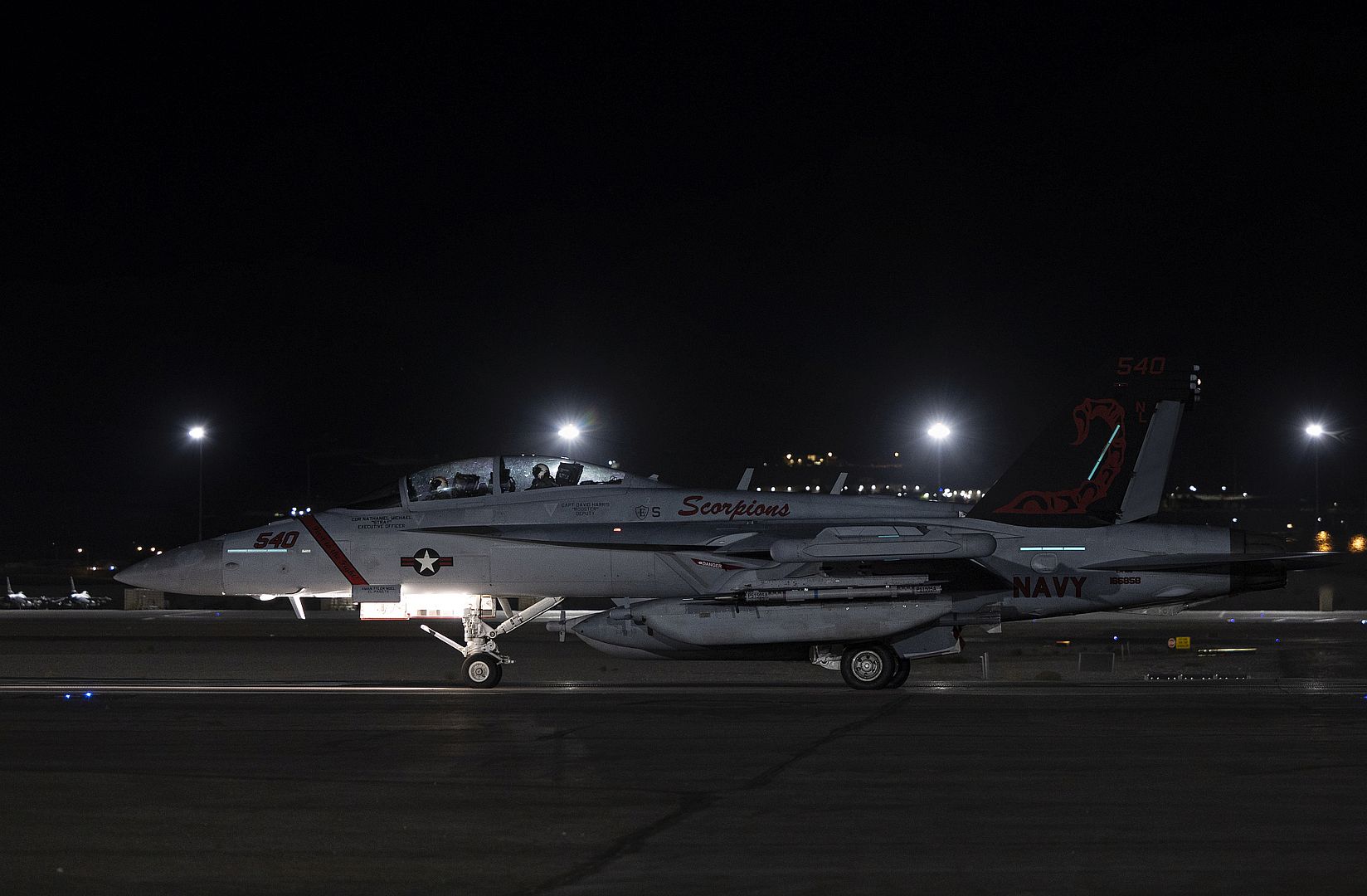 A U.S. Navy EA-18G Growler assigned to the Naval Air Station Whidbey Island, Washington, waits to take off for a late-night, Red Flag-Nellis mission at Nellis Air Force Base, Nevada, July 19, 2022. In the last fifteen years, the EA-18G Growler has spanned the globe in support of all major and rapid reaction action. (U.S. Air Force photo by William R. Lewis)