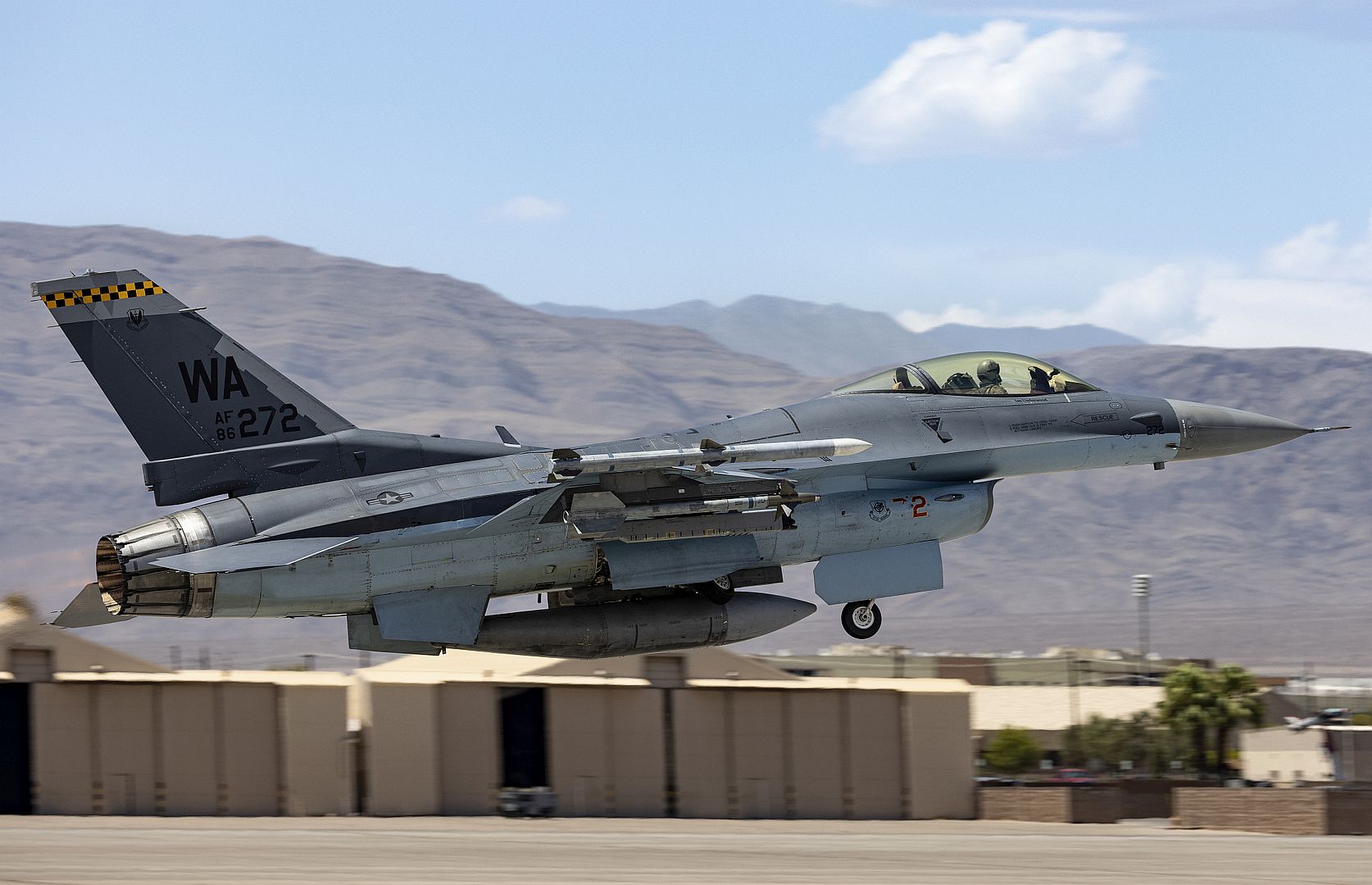 An F-16 Aggressor assigned to the 64th Aggressor Squadron, Nellis Air Force Base, Nevada, takes off for a mission during Red Flag-Nellis 22-3, July 18, 2022. During Red Flag 22-3 the aggressor nation refines threat replication, applies advanced threats and jamming capabilities and increased threat capabilities to maximize training in non-permissive environments. (U.S. Air Force photo by William R. Lewis)