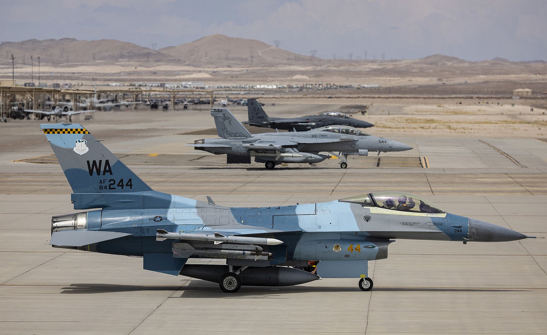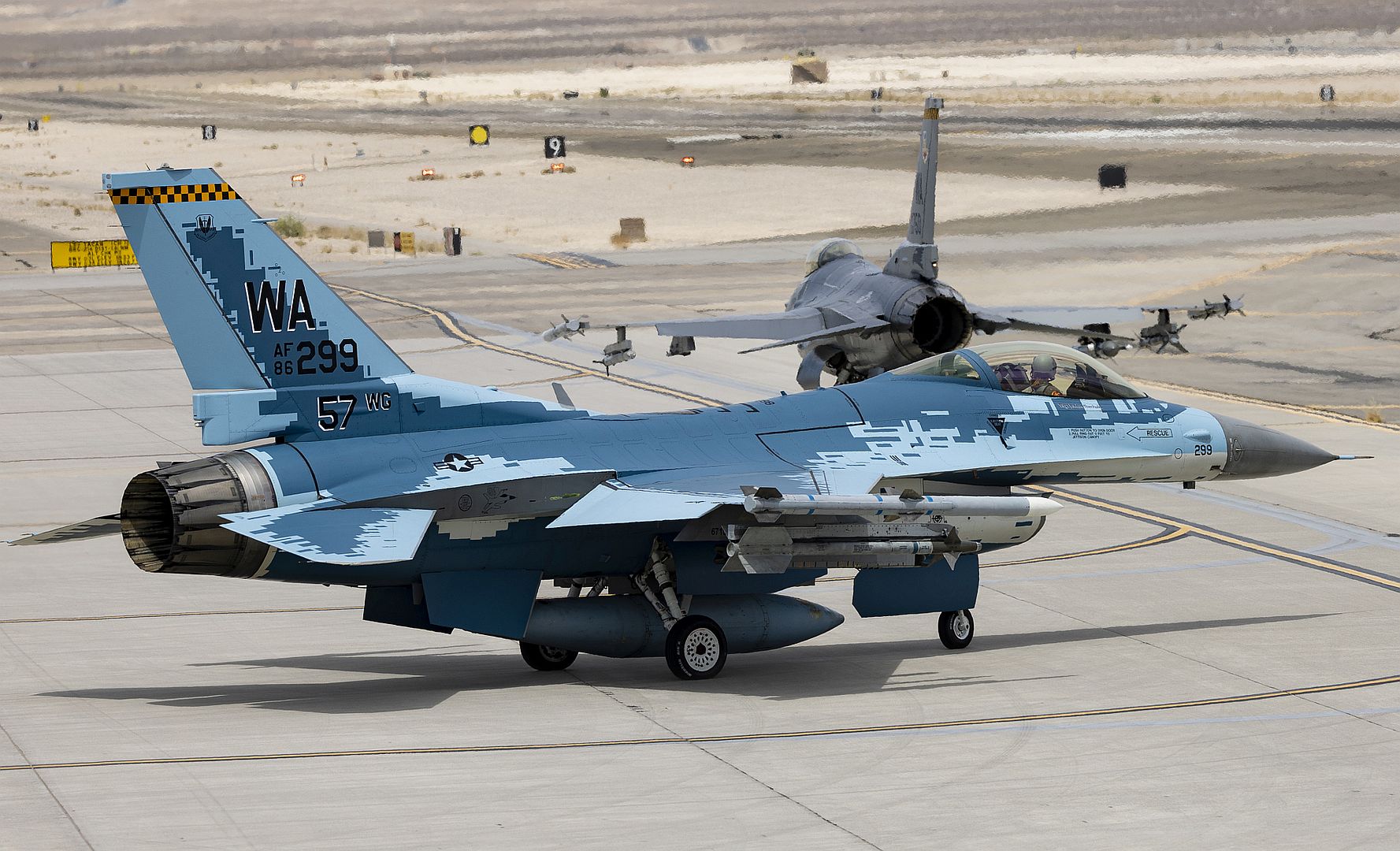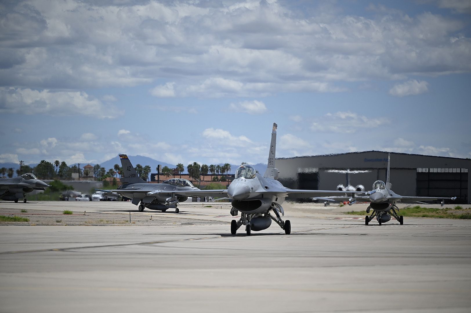 Two F-16 Aggressors assigned to the 64th Aggressor Squadron, Nellis Air Force Base, Nevada, prepare to take off for a mission, during Red Flag-Nellis 22-3, July 20, 2022. The 414th Combat Training Squadron conducts Red Flag exercises to provide aircrews the experience of multiple, intensive air combat sorties in the safety of a training environment. (U.S. Air Force photo by William R. Lewis)