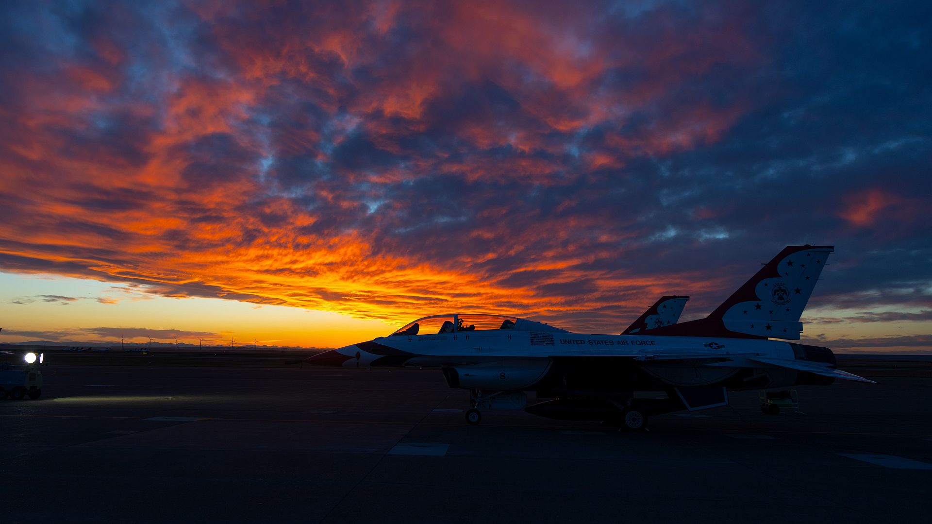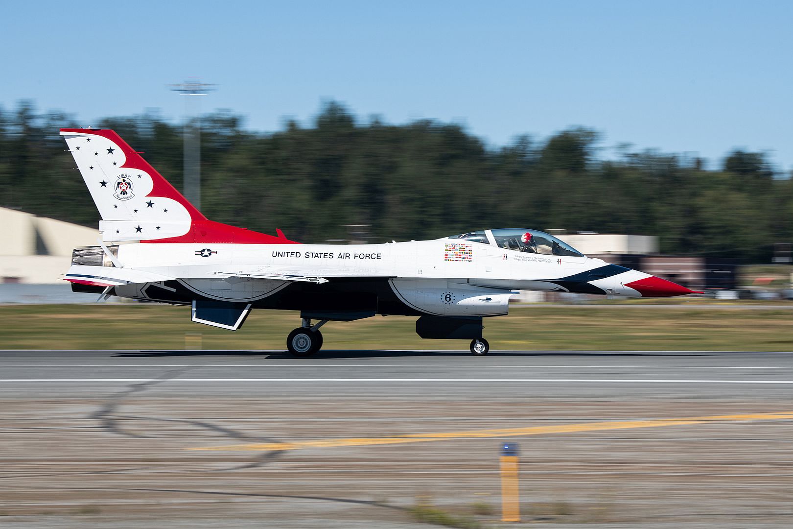 The U.S. Air Force Air Demonstration Squadron "Thunderbirds" F-16 FIghting Falcon on the ramp at Montana's Military Open House "Flight over the Falls" at Montana Air National Guard Base, Great Falls, Montana, July 23, 2022. The Thunderbirds are the U.S. Air Force's premier air demonstration squadron. (U.S. Air National Guard photo by Master Sergeant Joe A. Davis)