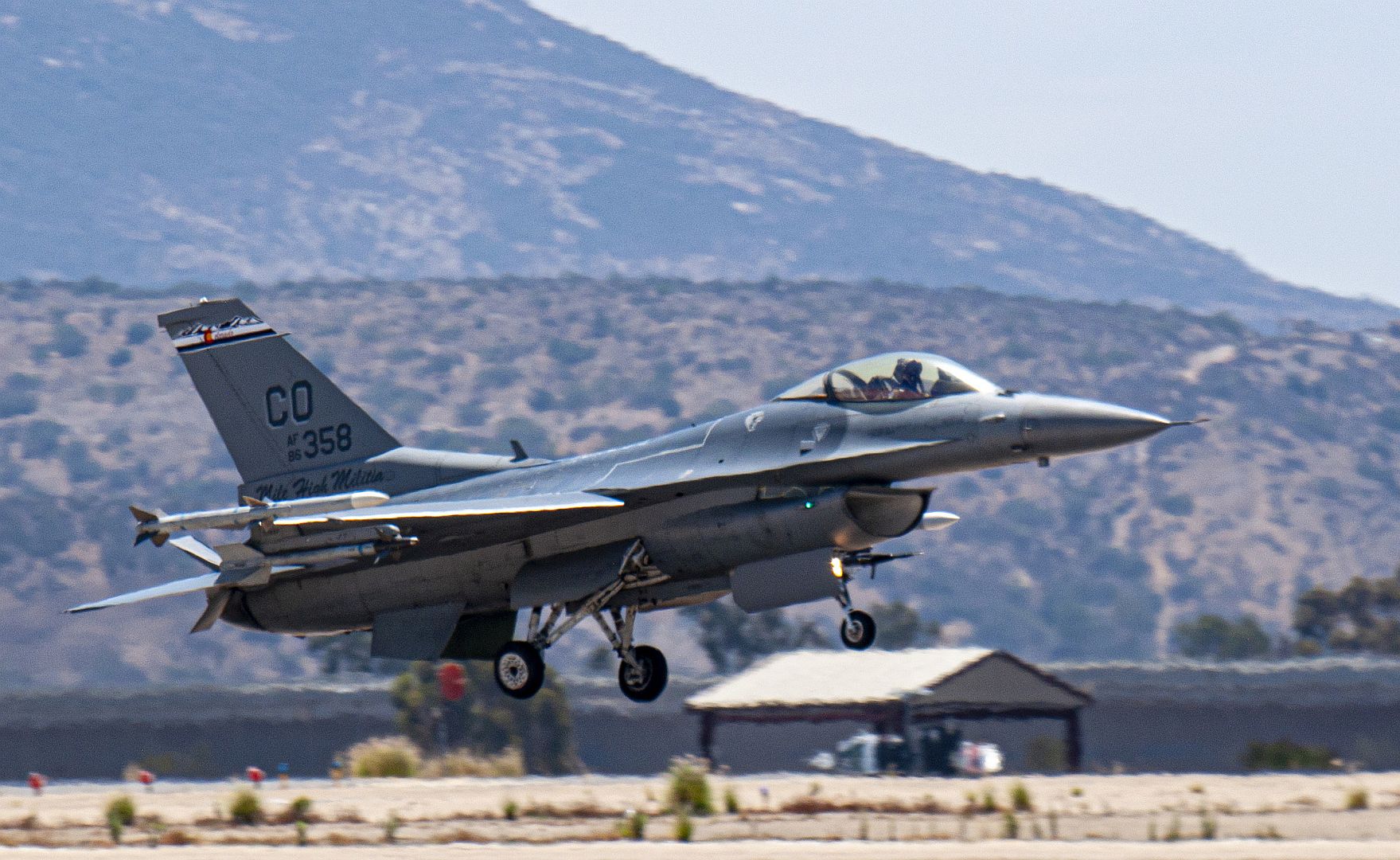 A U.S Air Force F-16 Fighting Falcon from the 120th Fighter Squadron, 140th Wing, Colorado Air National Guard, lands at Miramar Marine Corp Air Station, San Diego, California, Aug. 1, 2022. The 140th Wing is performing aerial maneuver training exercises with the F-35 Lightening II fighter jets, stationed at Miramar Marine Corp Air Station, to enhance their wartime readiness capabilities utilizing the latest combat scenarios. (U.S. Air National Guard photo by Master Sgt. Amanda Geiger)